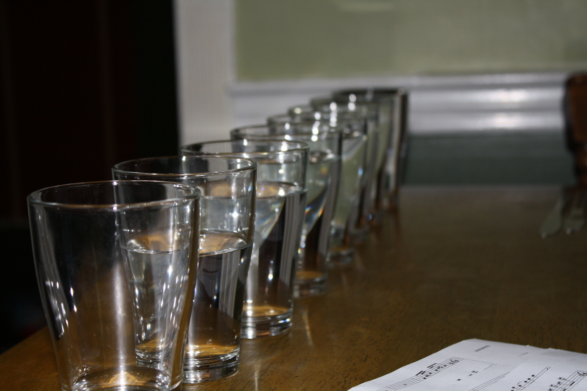 - A series of glasses, filled with varying amounts of water. Sounds sort of like chimes/xylophone. Tuned notes rather than a continual range.