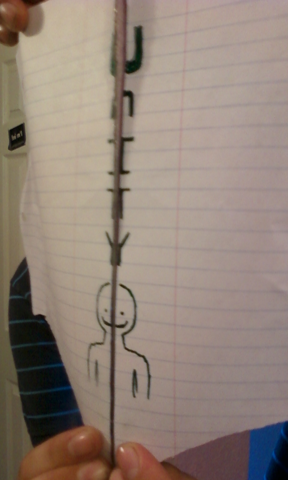 Requires a mirror to be understood, eh? I thought it might be a little too obvious if I just wrote something backwards, so I started there. I drew out my alphabet and tried to find the lines of symmetry in them. Cool! Now what? Make a word! I was never really good at that. Somehow, after about only a minute of looking at the letters, I made the word in my head. Unity. It wasn't just a word, though. After thinking for a bit on it, I realized that in the confusion of the letters, and the other halves of letters once it was put on paper, made sense when it was unified. I thought that was pretty rad.