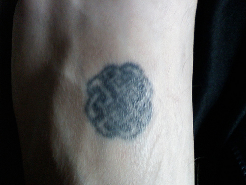 See, I really wanted some knotwork on my foot, a balance to the simple loop on the other, but reminiscent of the same thing. I found a knot I liked, I made a stencil, I sterilized a needle, mounted it and mixed up ink… But I couldn’t for the life of me pierce my own flesh with the gun. In the end I had my roommate and partner in street commerce, who was a dab sketch artist at any rate, use the gun that I set up to do the tattoo, and here it is, his first – sketchy, but decent nonetheless for what it is, tattoo.