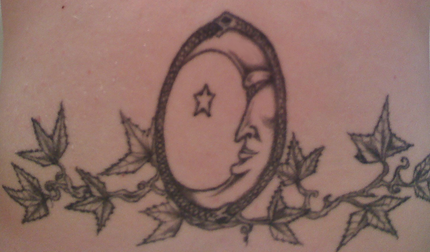 This last one is of particular significance in that it began as a memento of my son and has since become relevant to both of my biological children. Ivy is one of my favorite plants, it will always remind me of home as it has grown thickly everywhere along the west coast I ever lived. I love it. This ivy has 10 leaves, and each leaf has 3 points, specifically. This is to commemorate the birthdate of my son, who was born on October 3rd. I have always been fond of moons, I blame my mother, who also liked to decorate with them. Nonetheless, I have worn moon symbols since my early teens, and incorporating a moon into my biggest tattoo to date was a pretty sure thing.