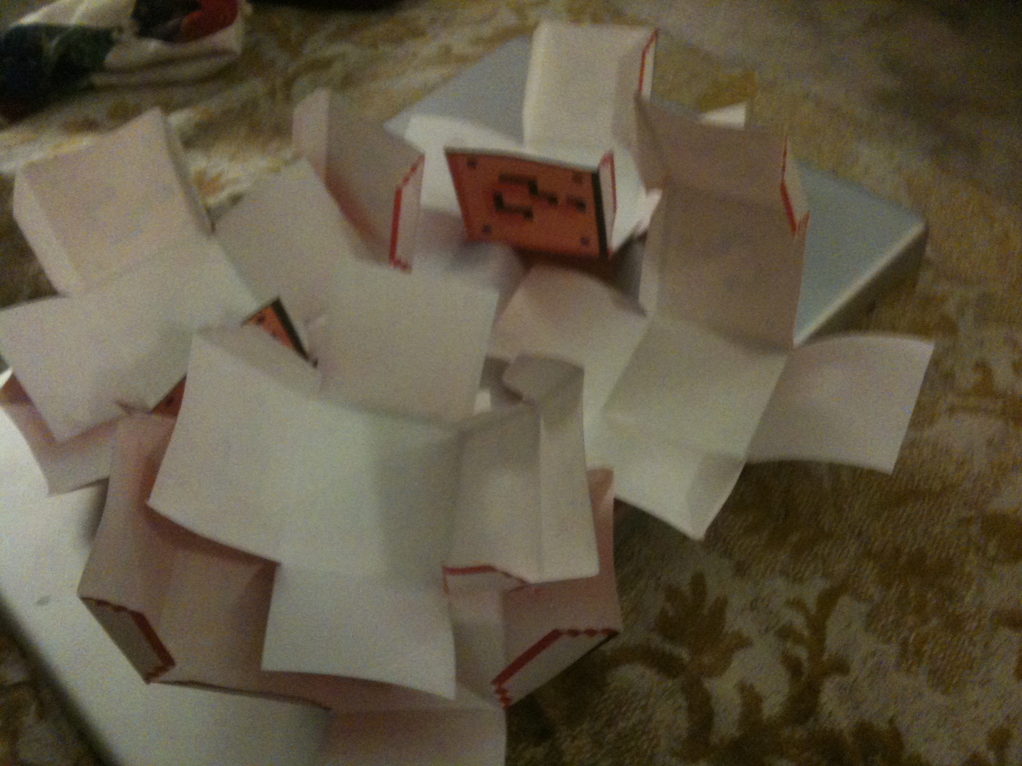 I downloaded a .pdf of a cube template from the above website, and printed it out on cardstock, about two inches on a side.