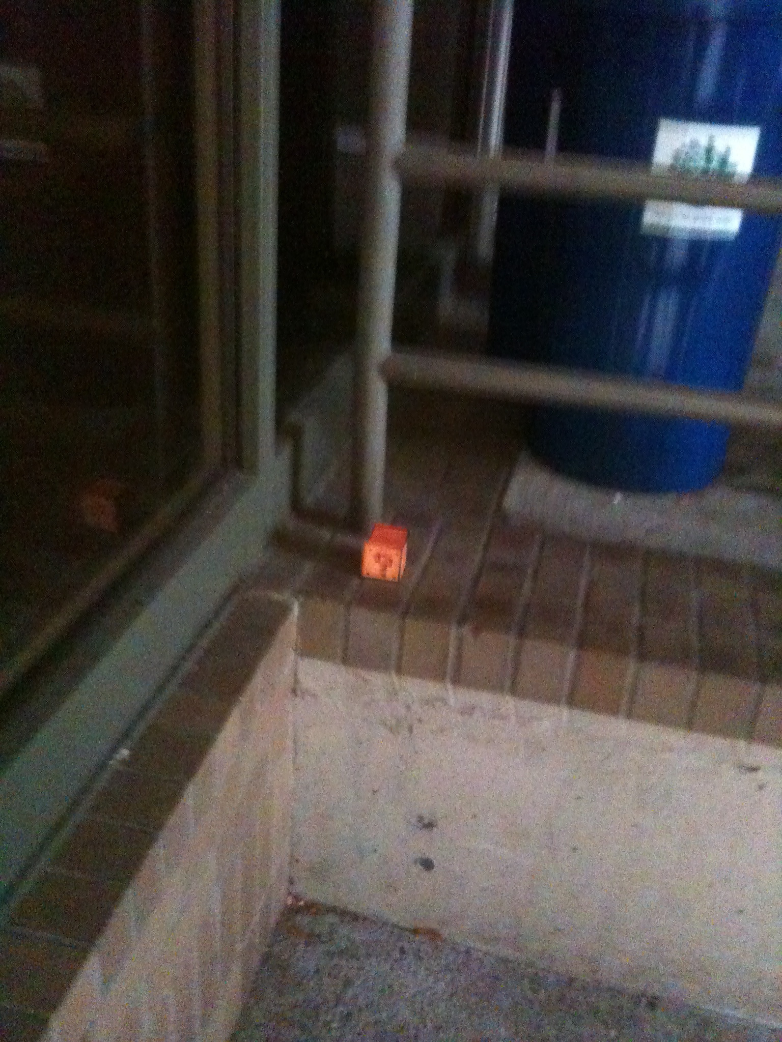 The first gust of wind blew that one off the railing, but when I checked back after my errand, it was still on the ground, not getting too soggy.