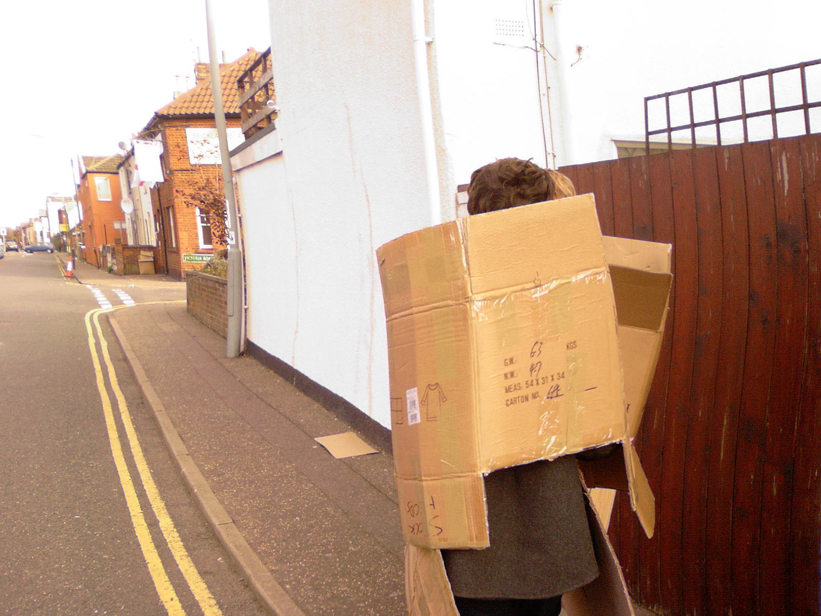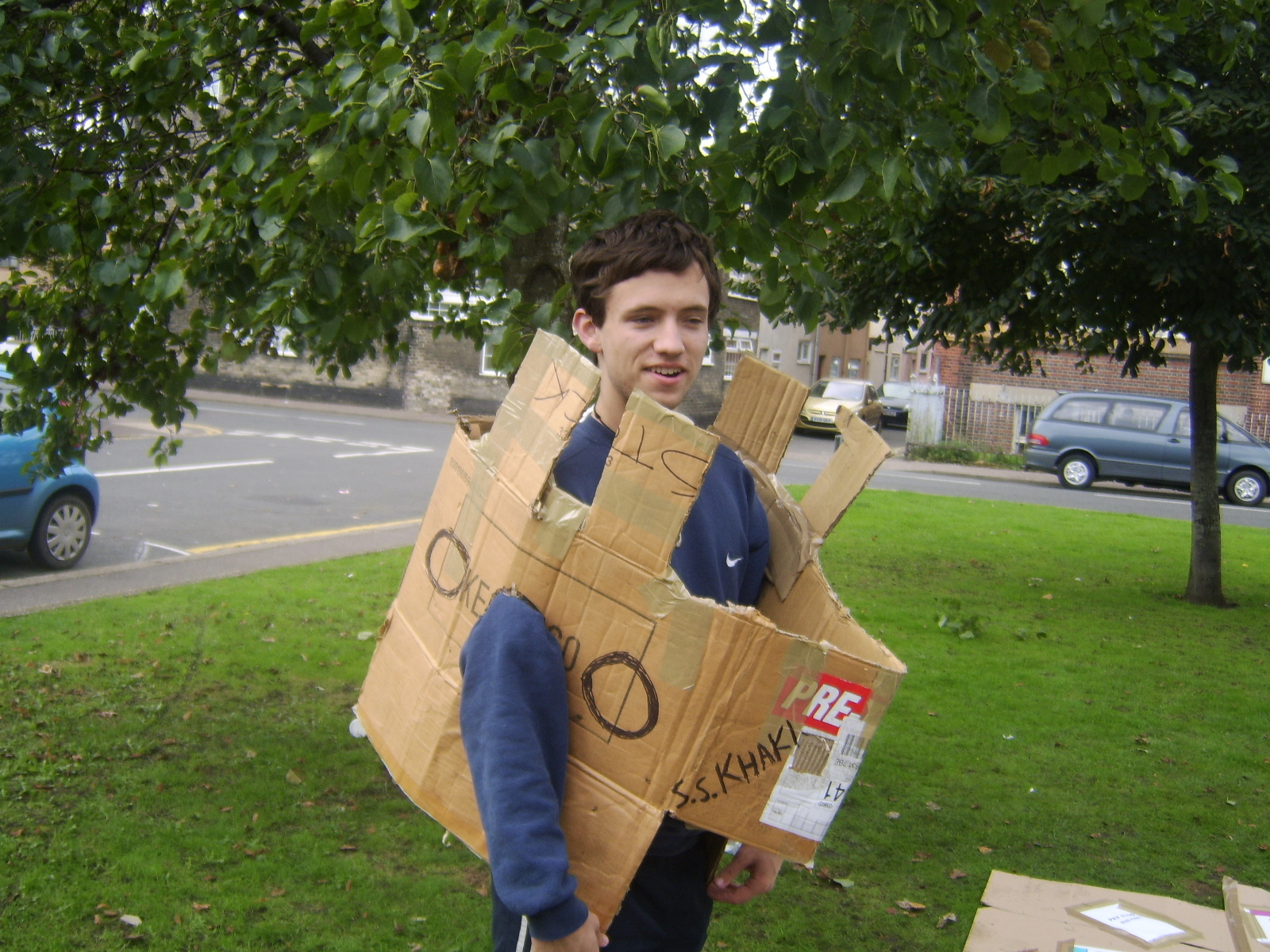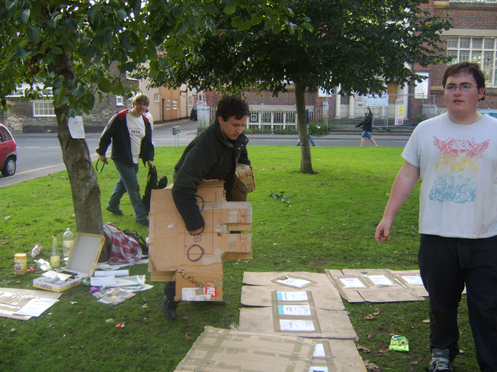 Walking down the road with a lot of cardboard, no matter how many people, is awkward, so we ended up wearing the boxes, it's just easier. So, walking to the location was an amusing experience, with more than one funny look along the way.