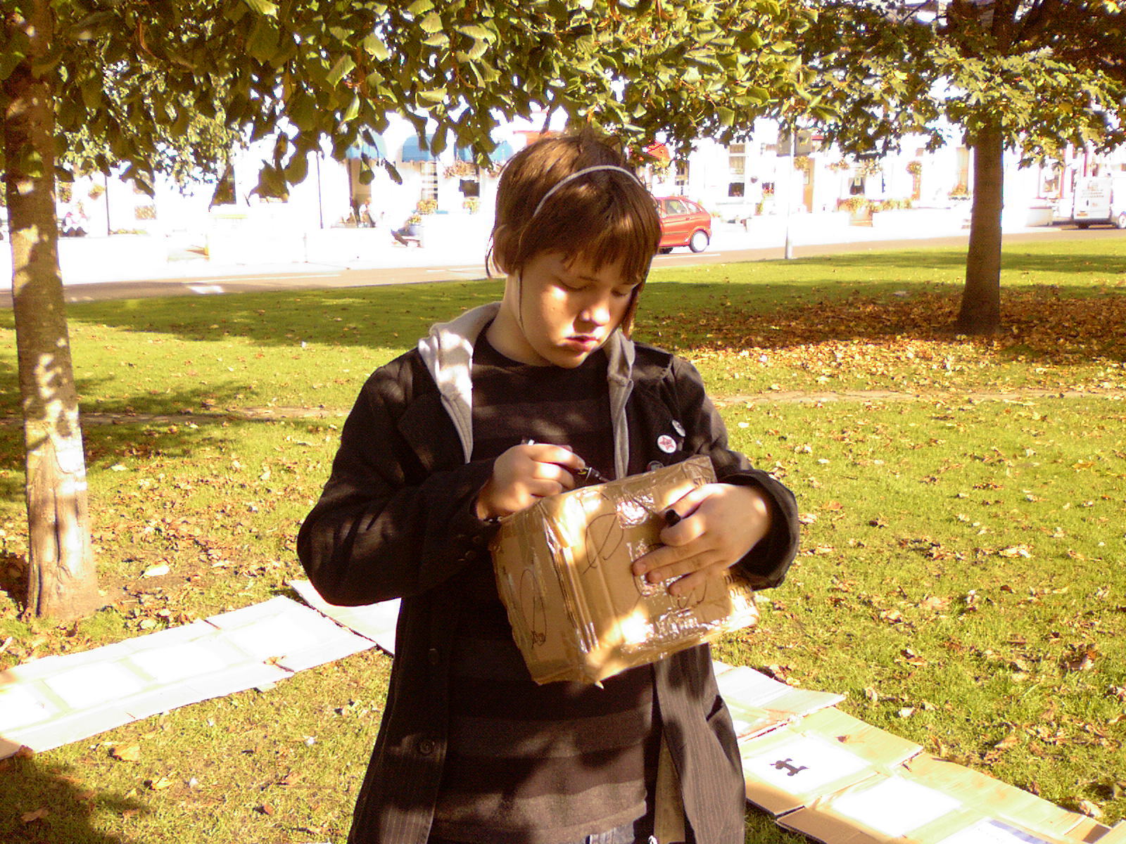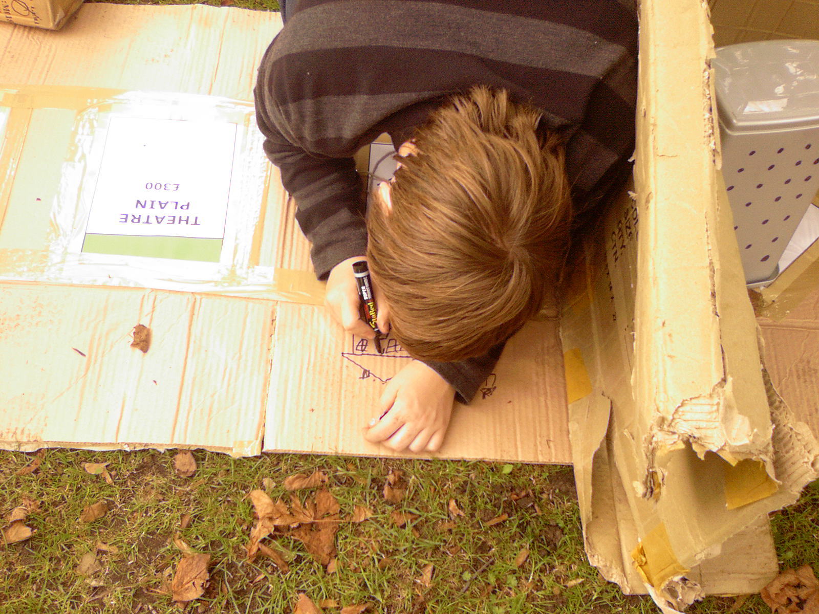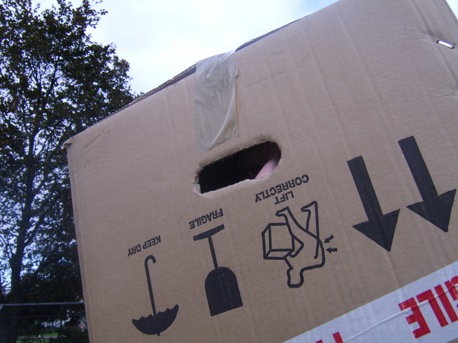 Walking down the road with a lot of cardboard, no matter how many people, is awkward, so we ended up wearing the boxes, it's just easier. So, walking to the location was an amusing experience, with more than one funny look along the way.