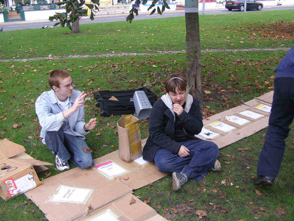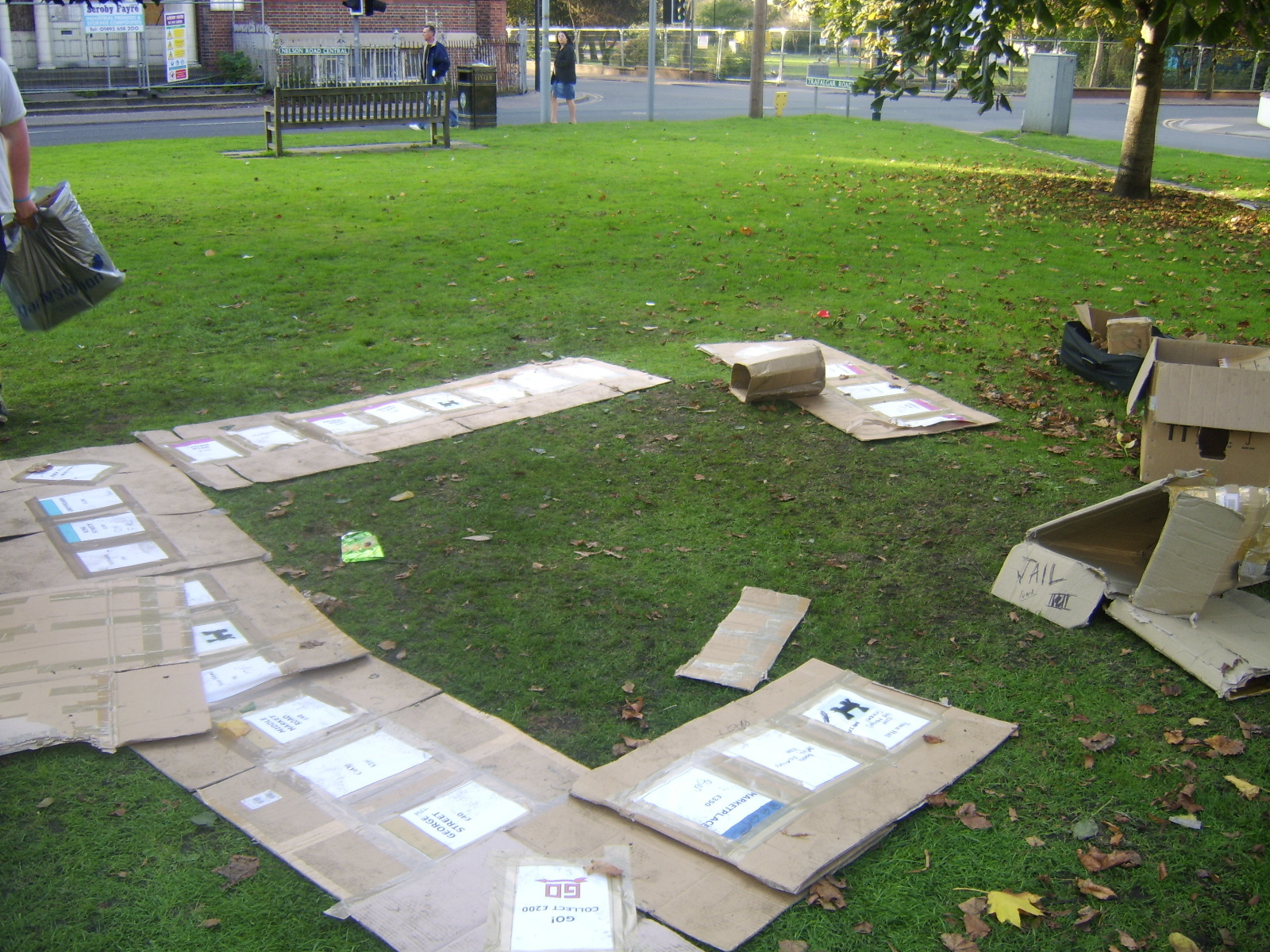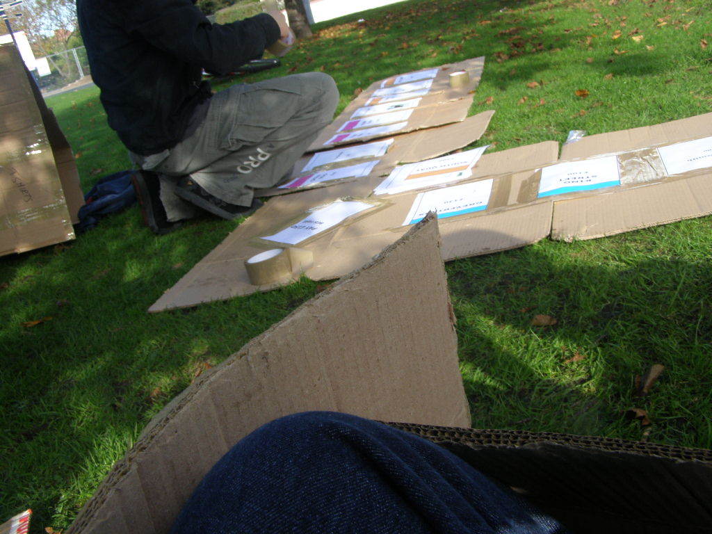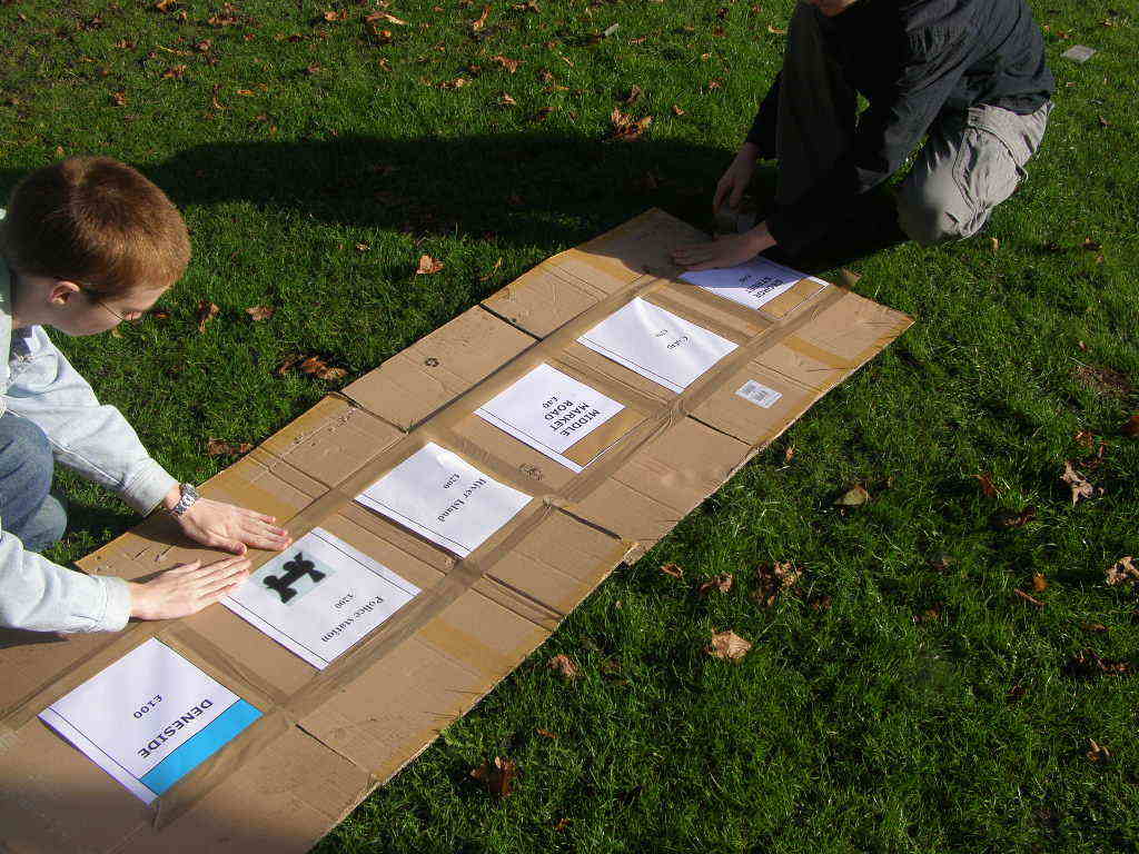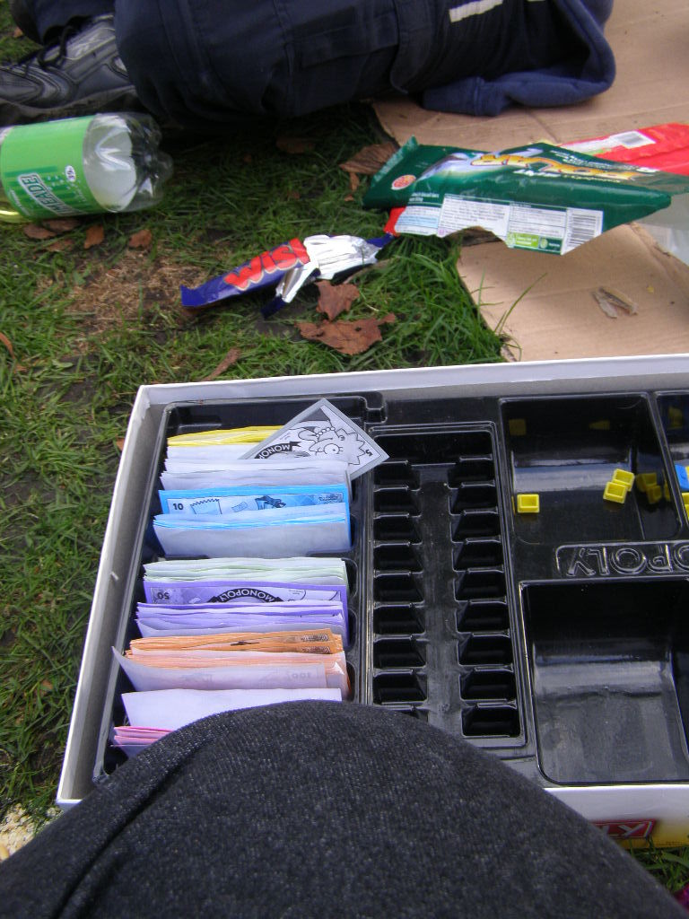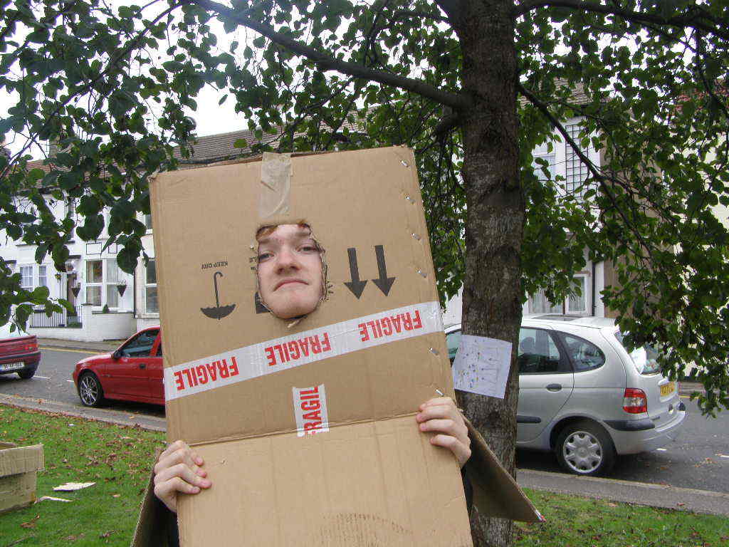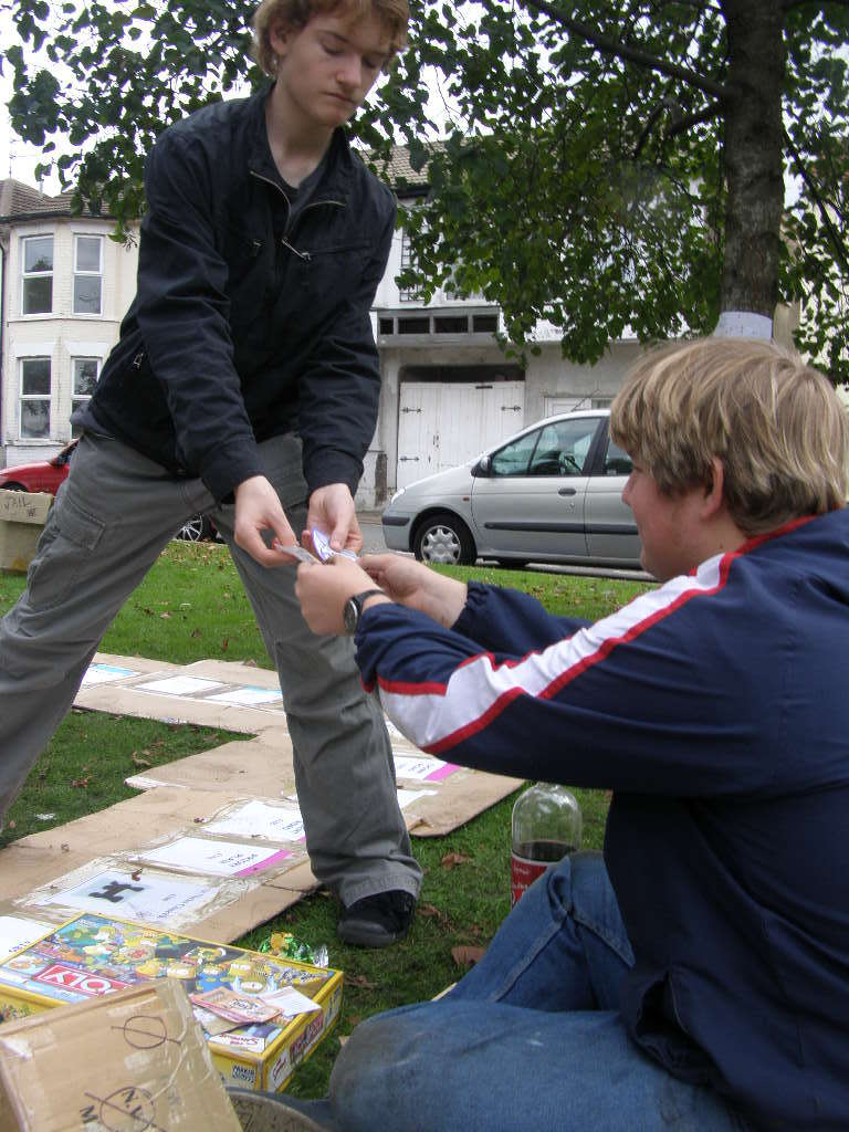 People then began turning up. Finally Brett arrived (last) and we were about to leave, when disaster struck! My parents arrived, and would not approve of the removal of their cardboard for creation of a large Monopoly board, so the door to the room full of cardboard was closed and obstructed and we helped unload the shopping. We then had to try and sneak the cardboard out of the house, and behind the front garden wall, which would shield it from view. We managed to get out the suitcase, and about two thirds of the remaining cardboard, and then we were chased away; luckily the room wasn't checked, so we got away.