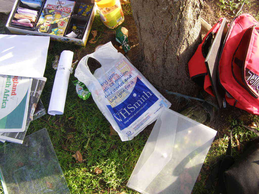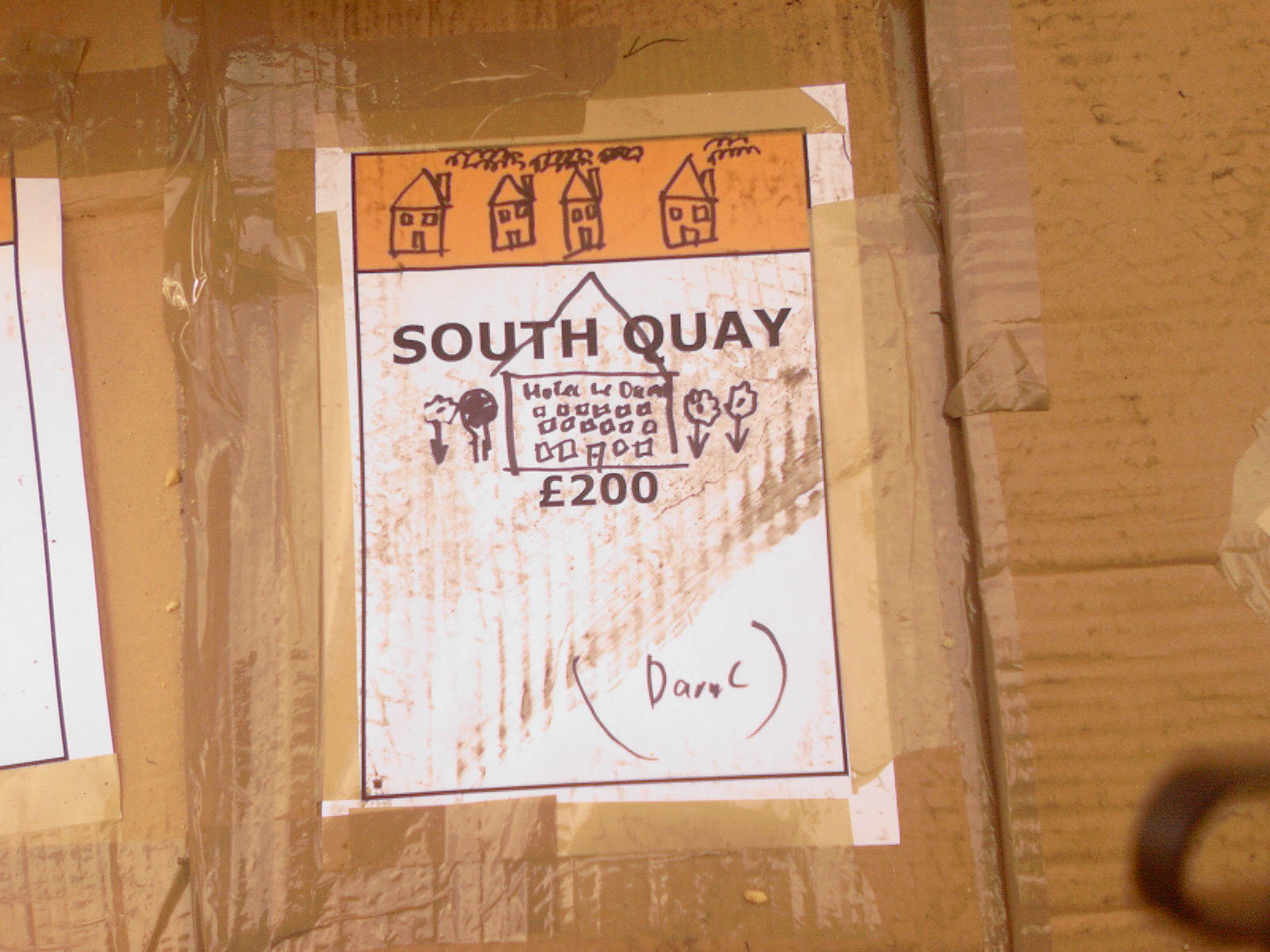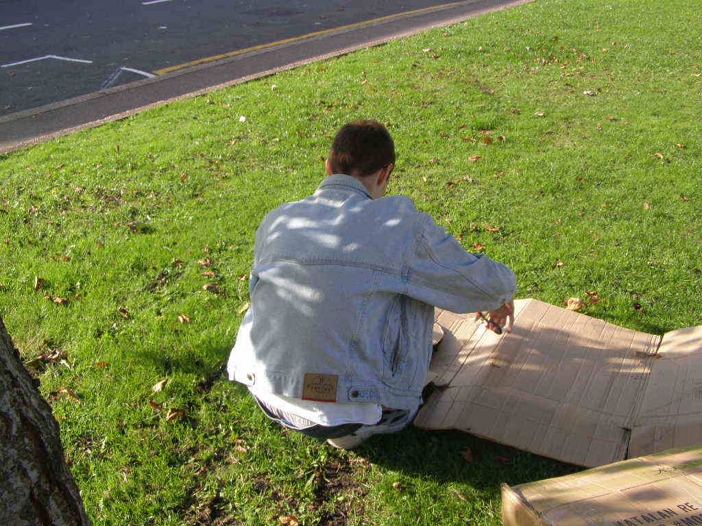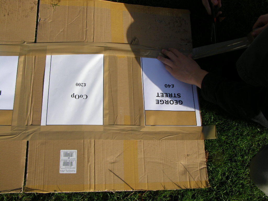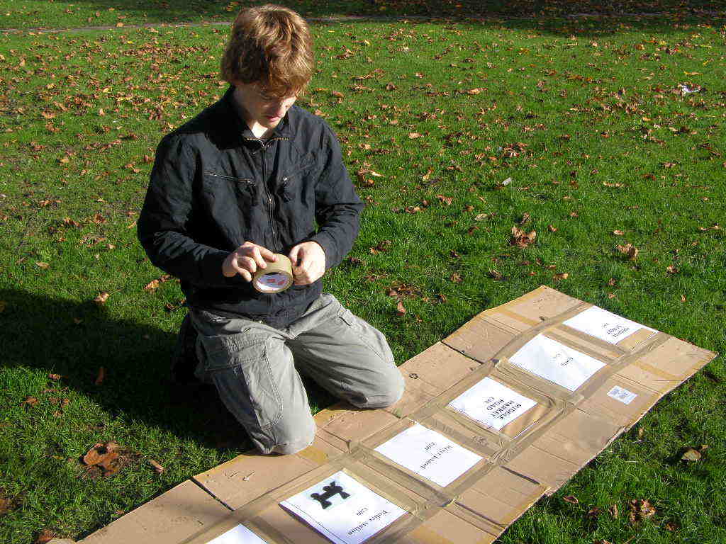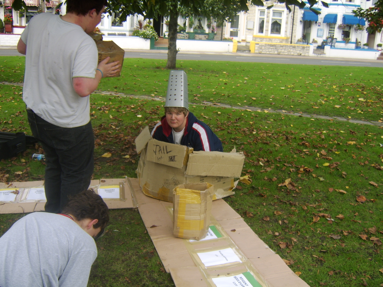 People then began turning up. Finally Brett arrived (last) and we were about to leave, when disaster struck! My parents arrived, and would not approve of the removal of their cardboard for creation of a large Monopoly board, so the door to the room full of cardboard was closed and obstructed and we helped unload the shopping. We then had to try and sneak the cardboard out of the house, and behind the front garden wall, which would shield it from view. We managed to get out the suitcase, and about two thirds of the remaining cardboard, and then we were chased away; luckily the room wasn't checked, so we got away.