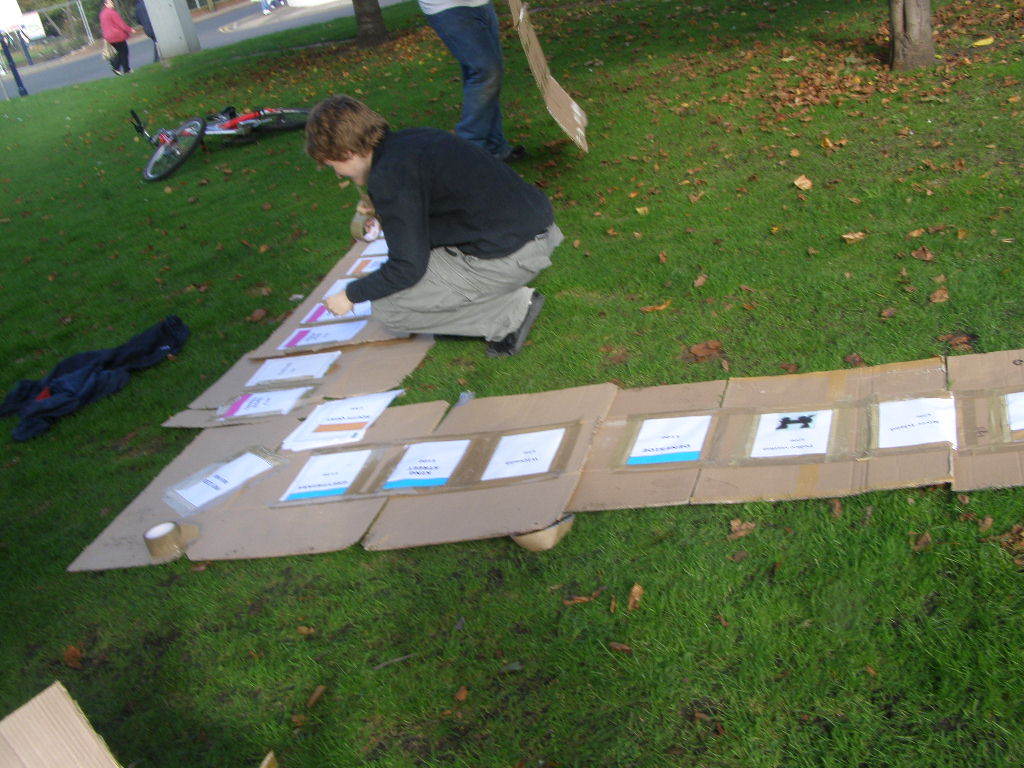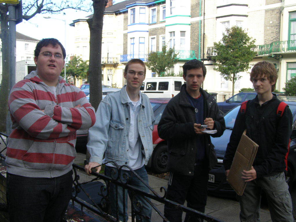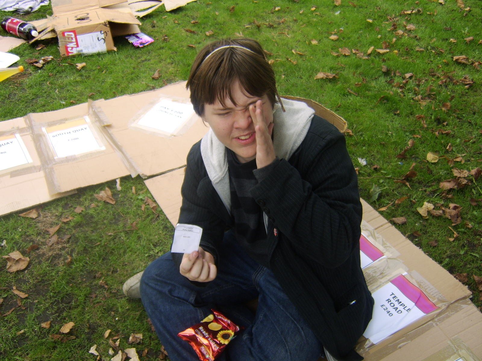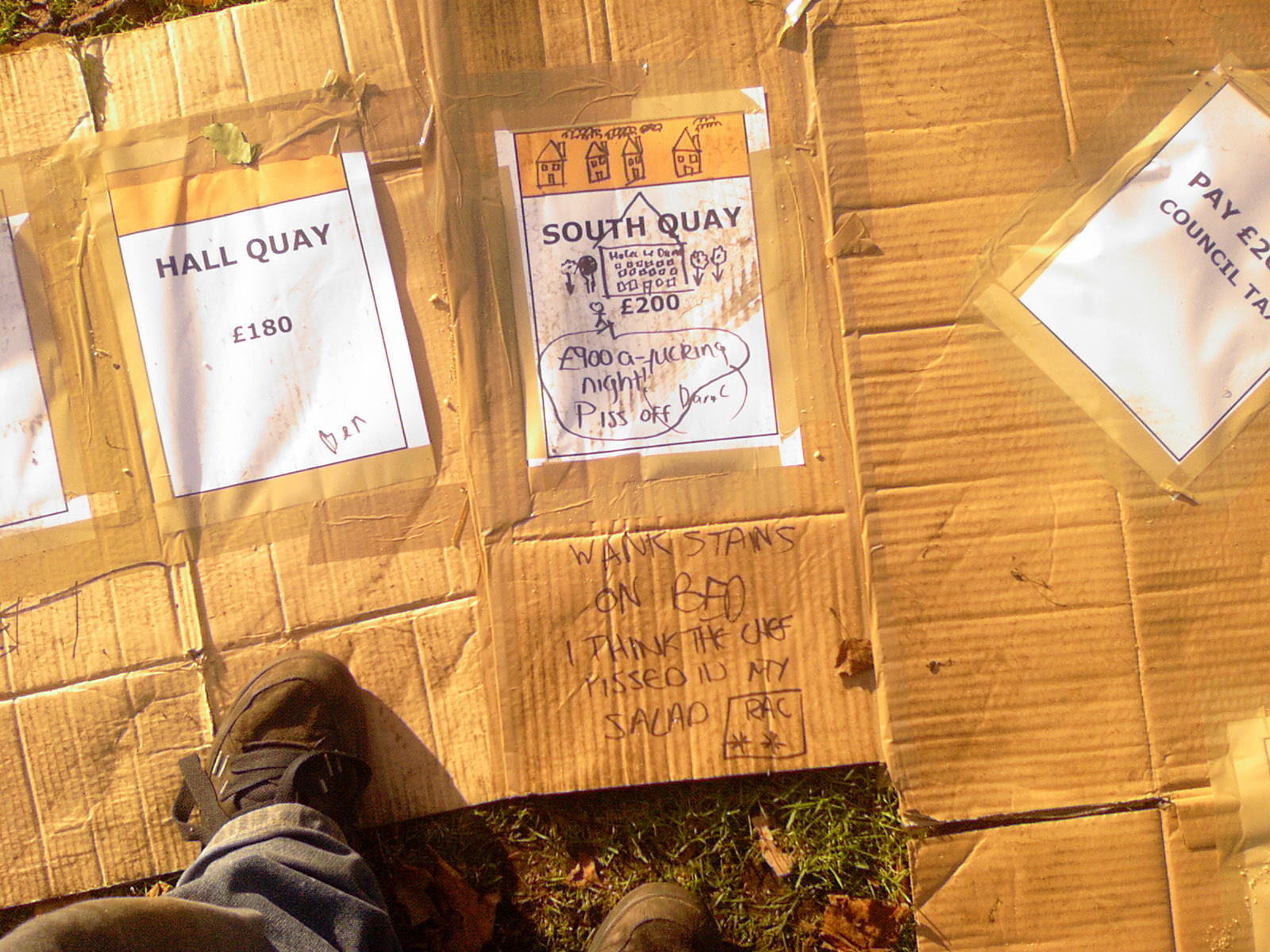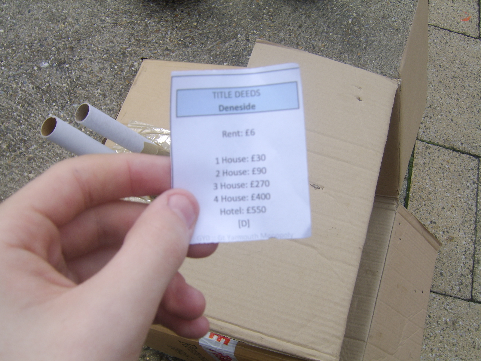People then began turning up. Finally Brett arrived (last) and we were about to leave, when disaster struck! My parents arrived, and would not approve of the removal of their cardboard for creation of a large Monopoly board, so the door to the room full of cardboard was closed and obstructed and we helped unload the shopping. We then had to try and sneak the cardboard out of the house, and behind the front garden wall, which would shield it from view. We managed to get out the suitcase, and about two thirds of the remaining cardboard, and then we were chased away; luckily the room wasn't checked, so we got away.