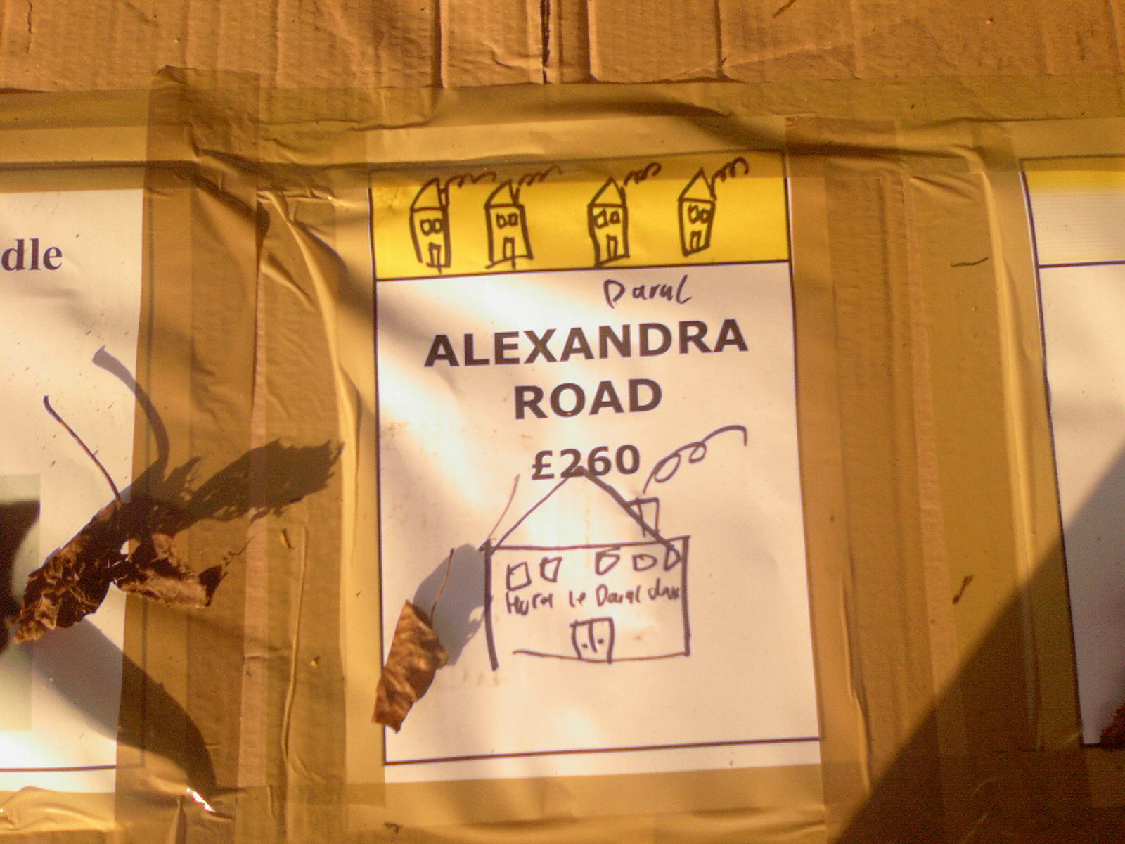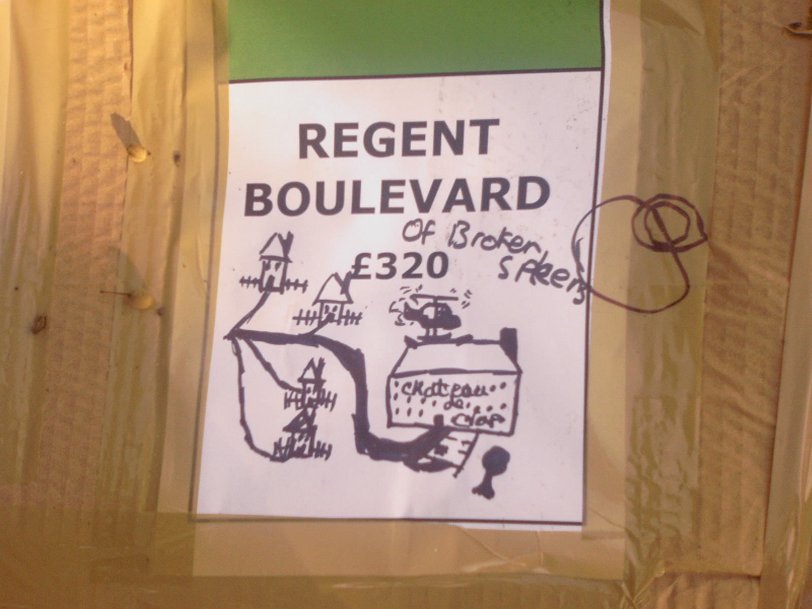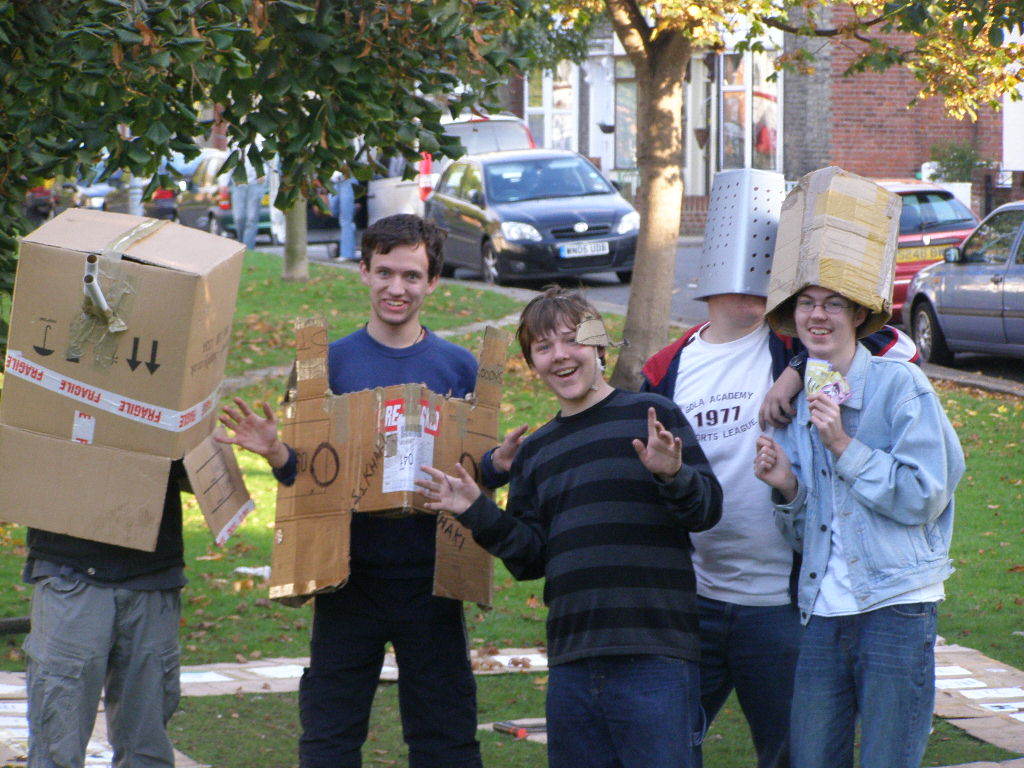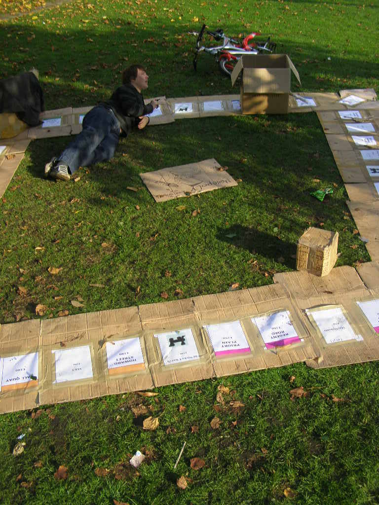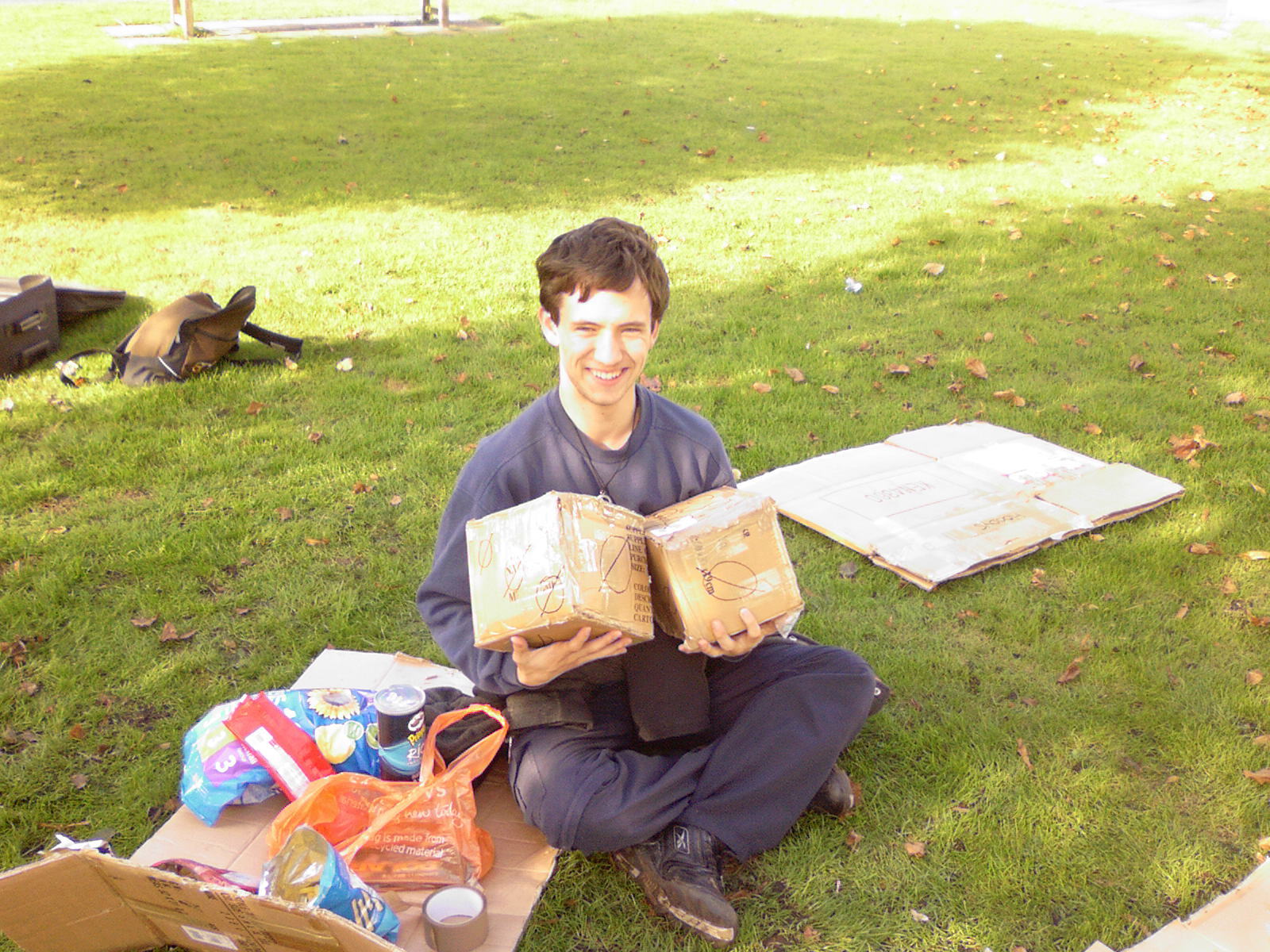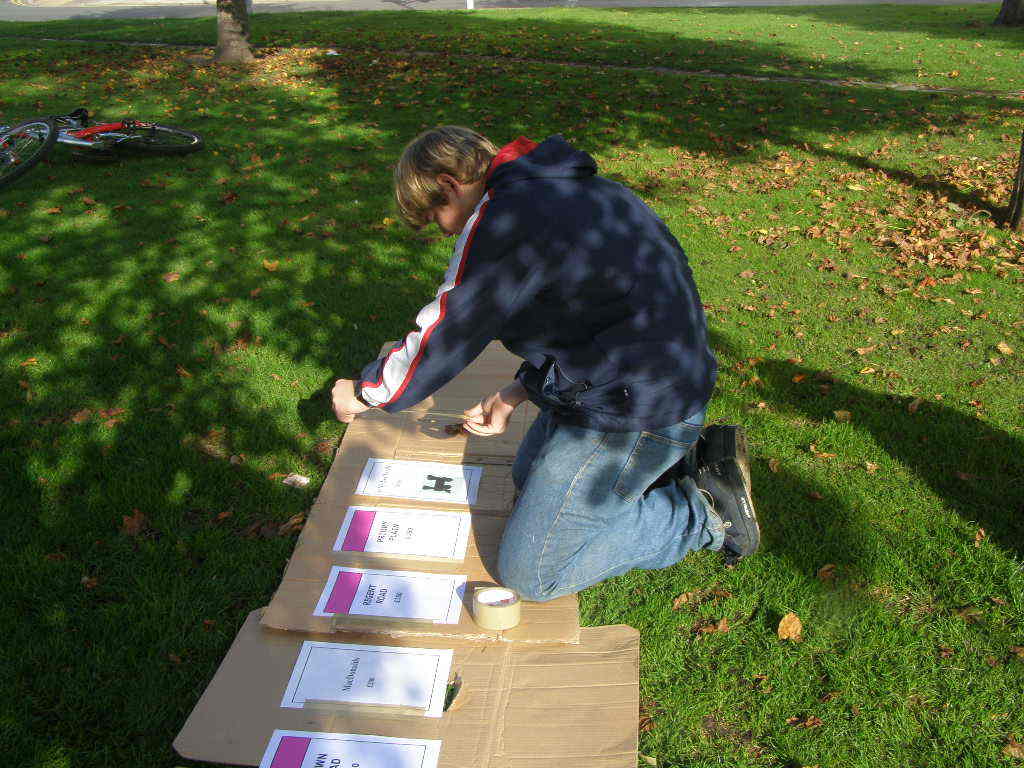 People then began turning up. Finally Brett arrived (last) and we were about to leave, when disaster struck! My parents arrived, and would not approve of the removal of their cardboard for creation of a large Monopoly board, so the door to the room full of cardboard was closed and obstructed and we helped unload the shopping. We then had to try and sneak the cardboard out of the house, and behind the front garden wall, which would shield it from view. We managed to get out the suitcase, and about two thirds of the remaining cardboard, and then we were chased away; luckily the room wasn't checked, so we got away.