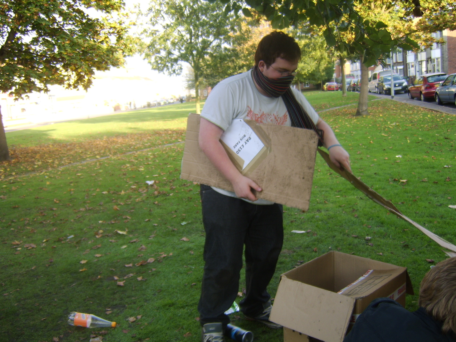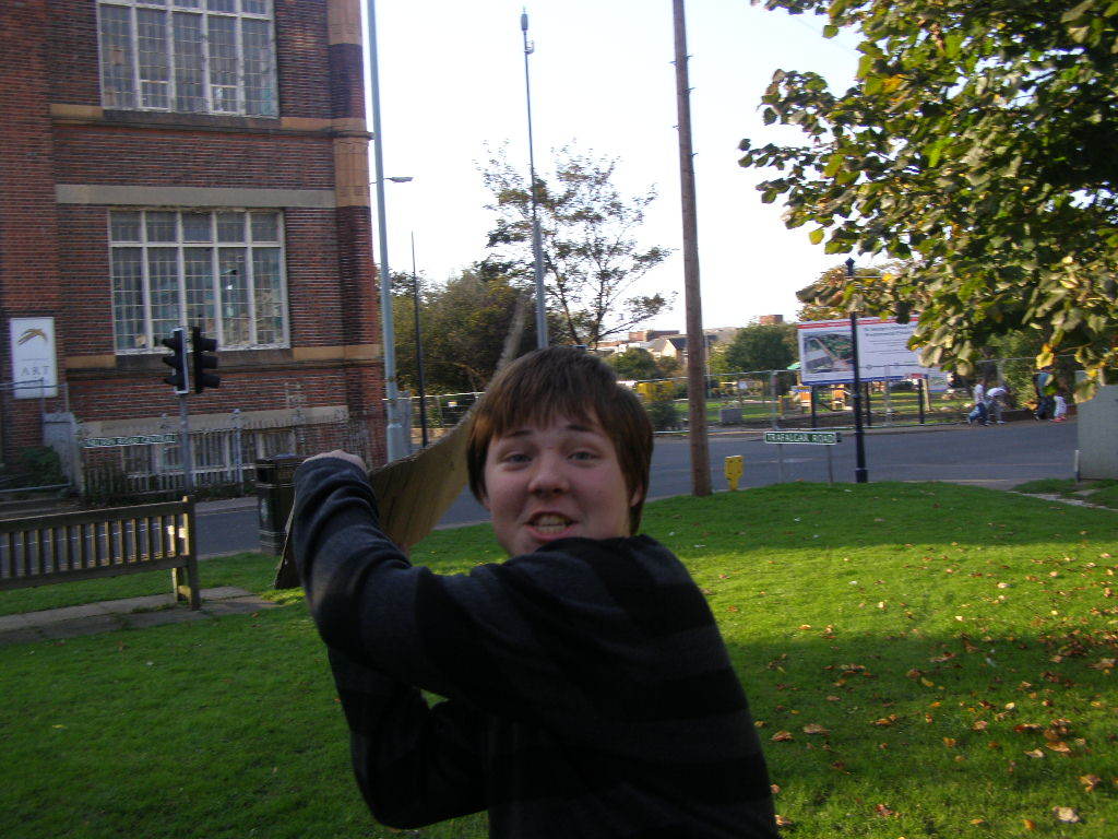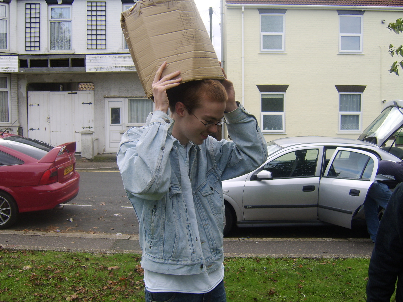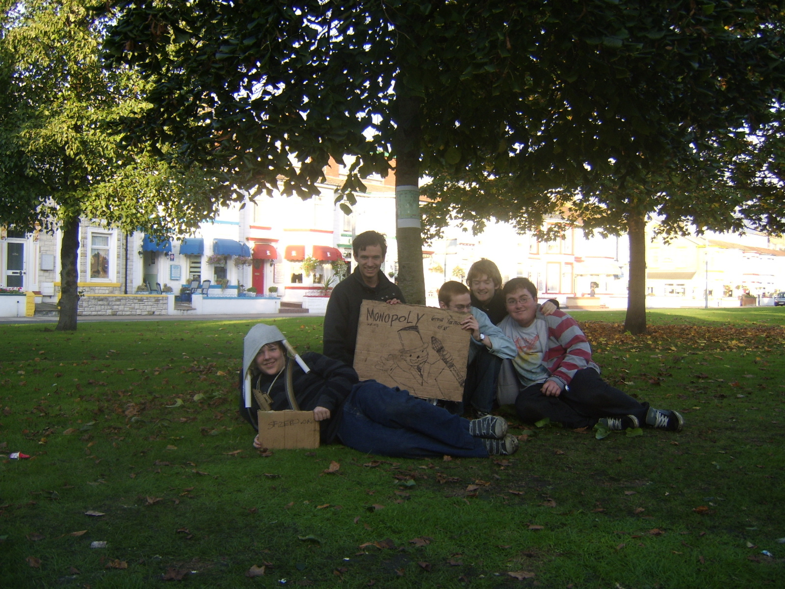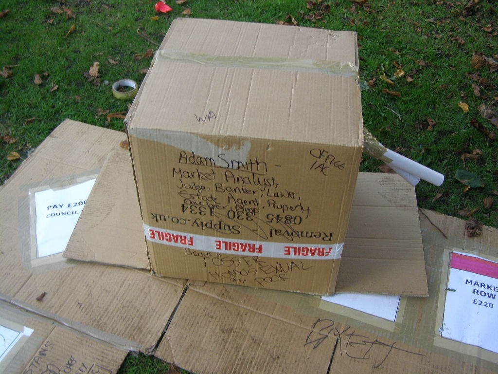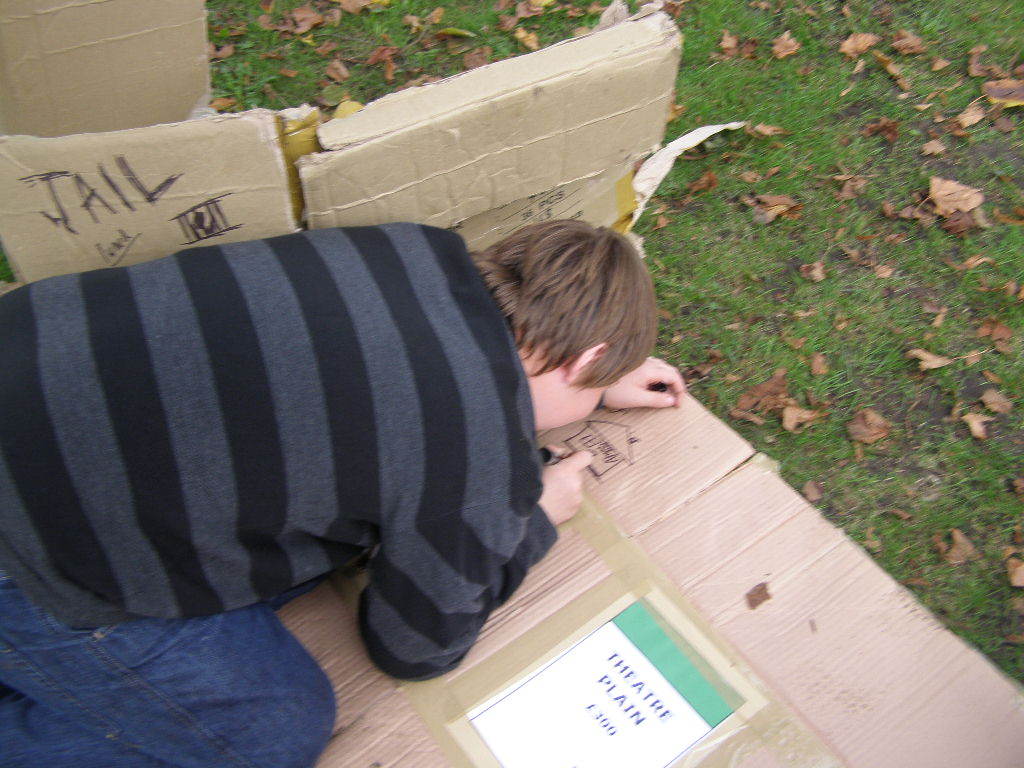 People then began turning up. Finally Brett arrived (last) and we were about to leave, when disaster struck! My parents arrived, and would not approve of the removal of their cardboard for creation of a large Monopoly board, so the door to the room full of cardboard was closed and obstructed and we helped unload the shopping. We then had to try and sneak the cardboard out of the house, and behind the front garden wall, which would shield it from view. We managed to get out the suitcase, and about two thirds of the remaining cardboard, and then we were chased away; luckily the room wasn't checked, so we got away.