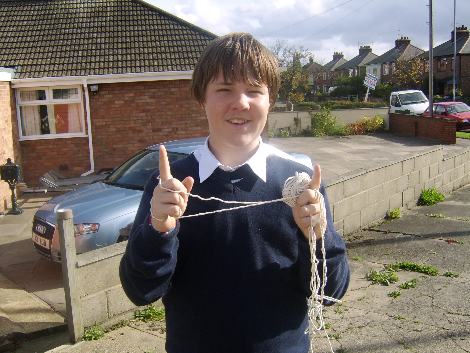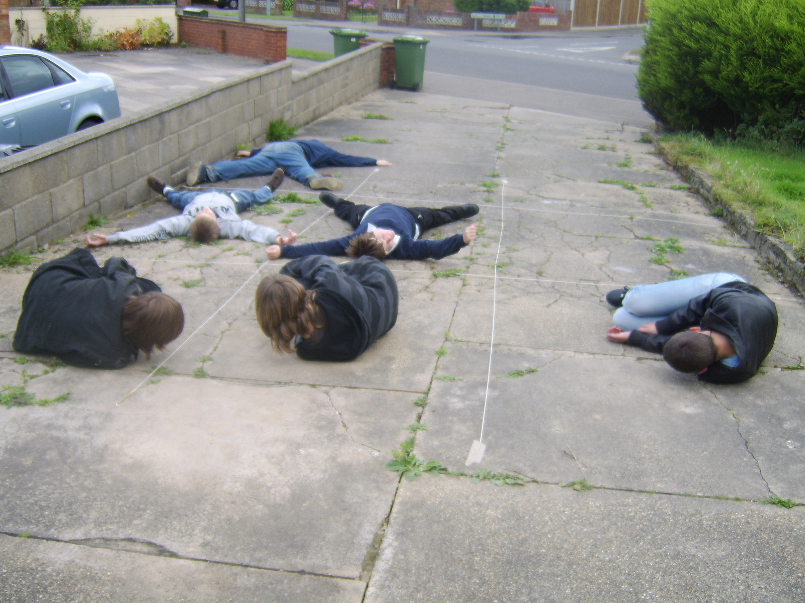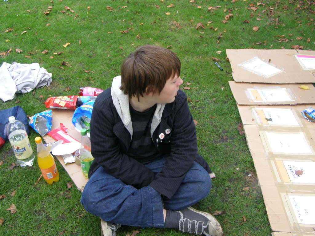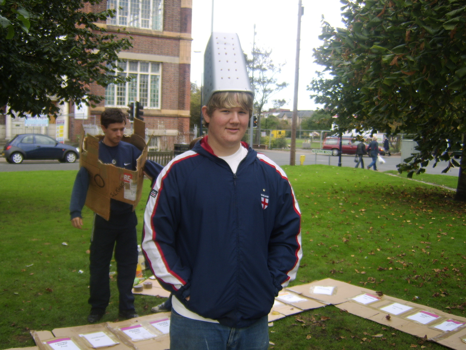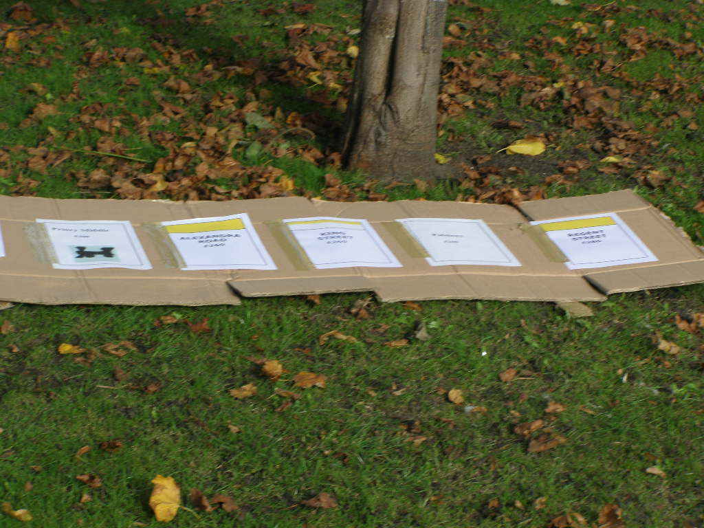 People then began turning up. Finally Brett arrived (last) and we were about to leave, when disaster struck! My parents arrived, and would not approve of the removal of their cardboard for creation of a large Monopoly board, so the door to the room full of cardboard was closed and obstructed and we helped unload the shopping. We then had to try and sneak the cardboard out of the house, and behind the front garden wall, which would shield it from view. We managed to get out the suitcase, and about two thirds of the remaining cardboard, and then we were chased away; luckily the room wasn't checked, so we got away.
