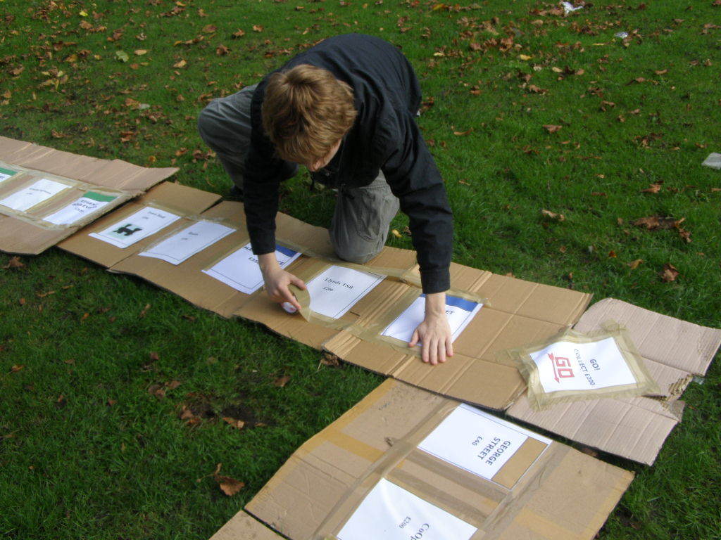 So, first things first, the board. After much discussion we decided to have the board larger, with space around the property pages stuck to them. We get to work, whilst Adam and Jordan are sent off to stock up on food and place the property cards.