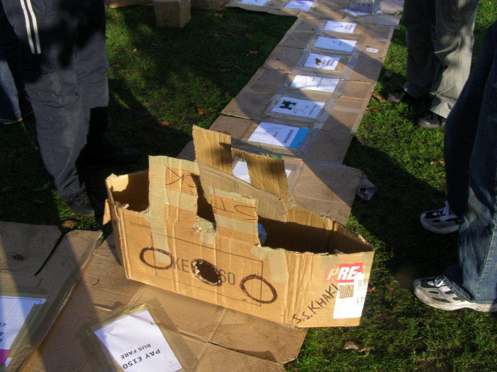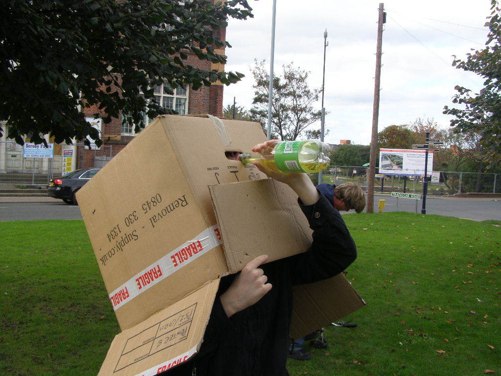 Tom: I wake up, check the clock and get up. It's 9:36, and I have another half hour till people begin to turn up. Or so I thought. I get downstairs, and go to check the post and catch a glimpse of Adam, camped out on my front door step. He'd been there for about 10 minutes, and had unsuccessfully attempted to wake me up with furious doorbell ringing and door knocking. He'd turned up early, not my fault! He was let in, and we began amassing cardboard for the task. After a lengthy period of hauling and a cunning idea by my sister, we had a suitcase full of cardboard, surrounded by more cardboard.