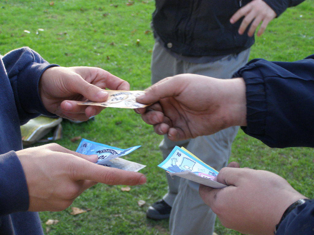 Adam returns, and being tired decides to be the banker. We hand out the starting cash and we're ready to roll!