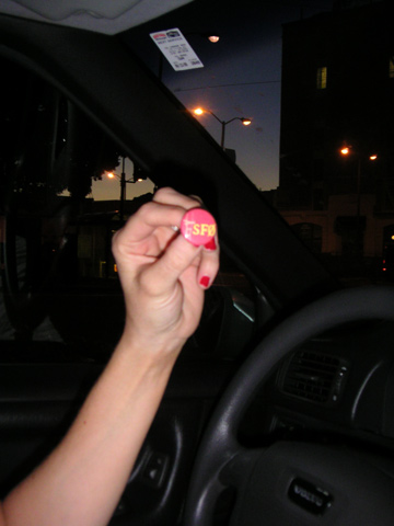 here we met a few new players, met sarah for the first time (yay!) and ran into nicole (who got separated from her team). some of the players, i forget their names unfortunately, say that their apartment is in between checkpoints and invite us to come chill at their place for a bit, but we are feeling terribly behind and decide to try to make up time. we cross the street to catch the bus and a purple woman tags us ever so excitedly, but is disappointed to find out we are in a safe zone! while we wait for the bus we start trying to catch a ride. finally someone rolls down a window, but they aren't going our way. luckily the car behind them is sympathetic and we jump in. the driver's name is bethany and we begin elatedly explaining sf0. we continue talking and find out that she actually thought that we needed directions and had not invited us into her car. but she is cool, enjoys our sf0 stories, and drops us straight into at checkpoint 3 (billiard place on geary between wood and collins). we give her an sf0 pin.