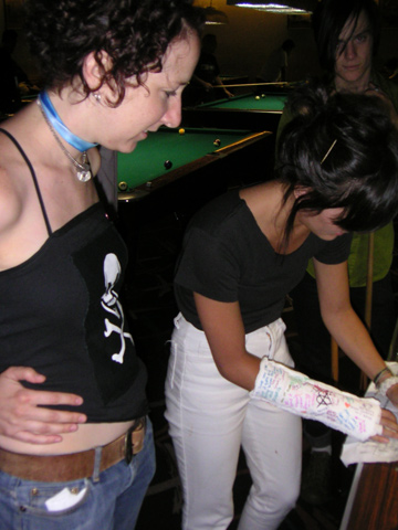piratey monkey and i (vladypus) arrive at the meeting place and join jason & co in one big group. after determining the nature of the game however, we decide that it would be more effective if we broke off as a pair. the game starts and everyone runs for it in a giant herd. monkey and i almost immediately choose a different direction to get away from the group. within a few blocks we are totally lost. we slowly make our way and eventually we get on some bus, which is full of other players. we notice that i have already managed to lose my player ribbon, and we cut a piece of monkey's off and pin it to my shirt.