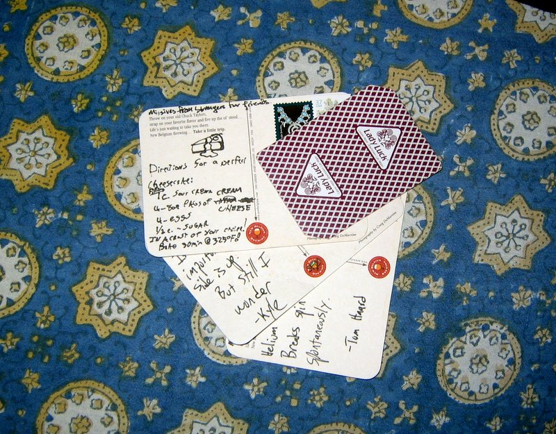 i actually completed this task ages ago. but was too lazy to buy stamps. i was in a bar. the costers convienently doubled as postcards. strangers abounded. (abounded? is that a word?!) i have covered up the address, because these babies are winging their way to one of YOU, right now...