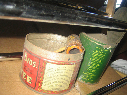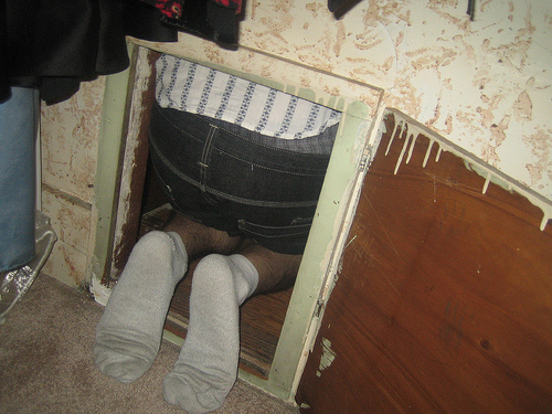 remarkably enough, i managed to urban explore, right in my very own home. I was just beginning to move in, so while not technically "abandoned", it was moreorless "unoccupied" at the time. Just beginning to put things in my closet, i found a tiny door. This tiny door led into a huge secret space inside the wall. of course, it had to be immediately and thourghly explored. With the help of Vladypus, who had gotten roped into helping me move, we crawled inside, found much treasure, and just when we thought we had reached the end of our journey we discovered another space at the end. it turned out that it was possible to crawl along a very long and very narrow space balanced on a single roof beam along the front eves of the house to another huge secret room at the front of the house (this room is begging to be filled with secret treasure, or large murals). it was slow going, many splinters were recieved, and we ran the risk of falling through the cieling if we lost our ballance on the narrow beams, but an exciting adventure to have in one's own home! Especially near the front of the room there was much treasure found, including coffee cans that appear to have been filled with newspapers (which have since disintagrated), a purse with small metal figurines in it, and really bad porn from the 80's.
