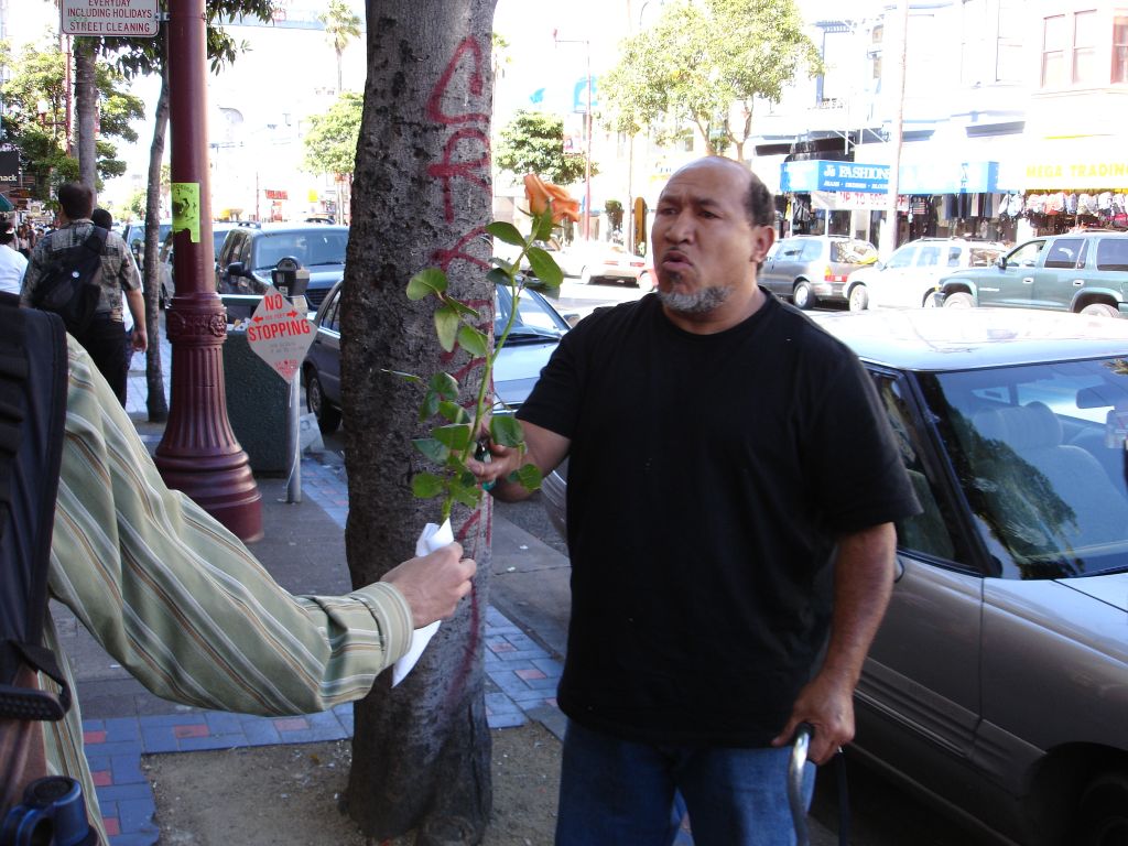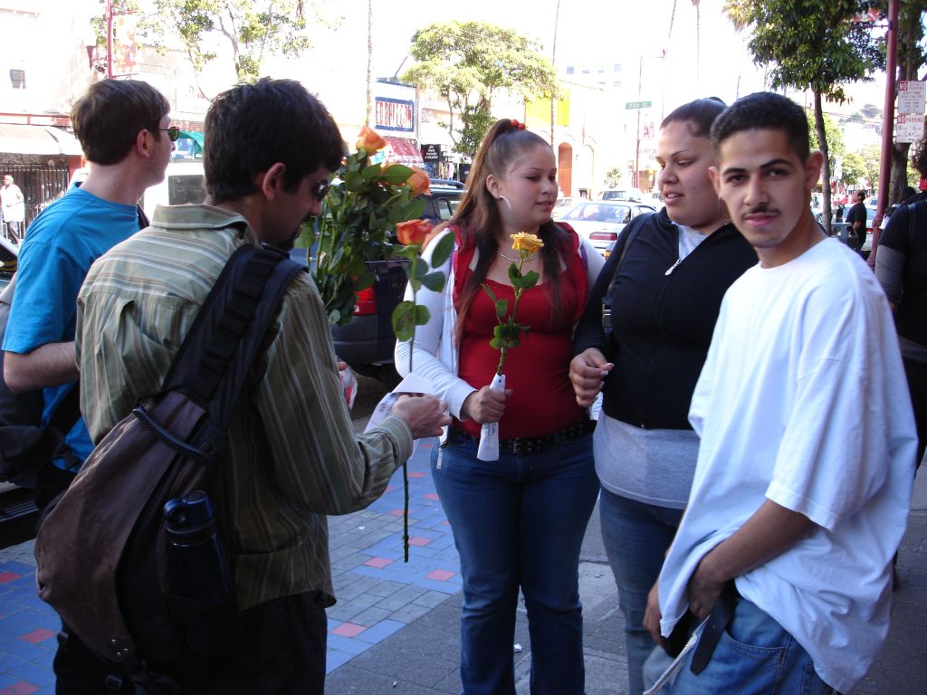 Rubin: So the first guy I give an orange rose to is this guy in the black shirt, yelling. Like FUCKING YELLING. And he starts yelling louder right when I give him the first rose. Kelly comes around and gives him another, and now he's FUCKING BLASTING, we were still hearing him two blocks away telling a story about the 8th coming. Amazing stuff.