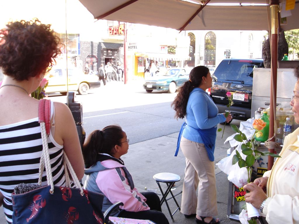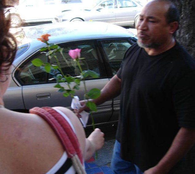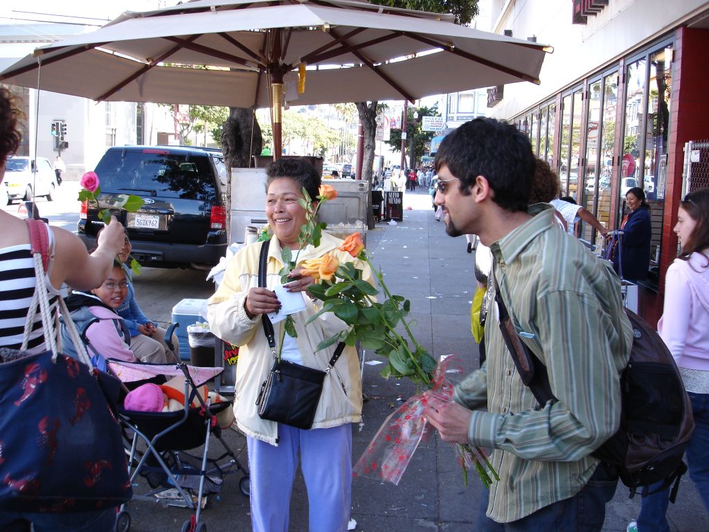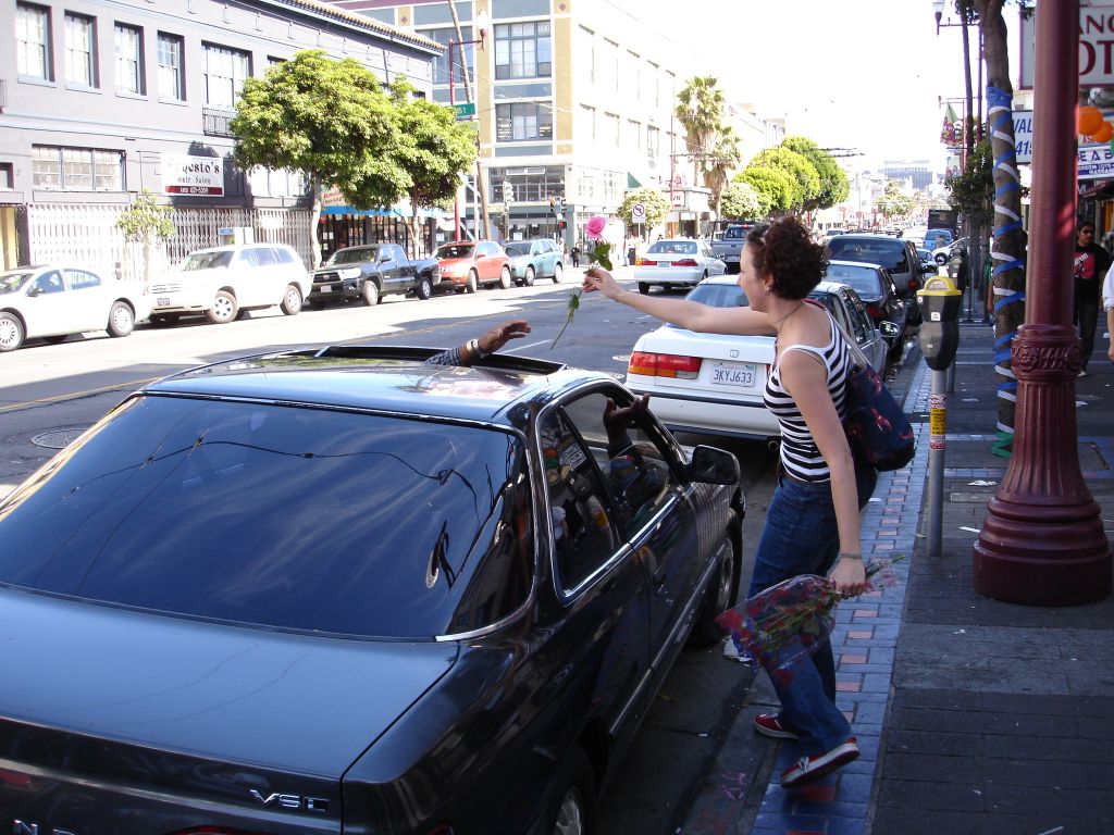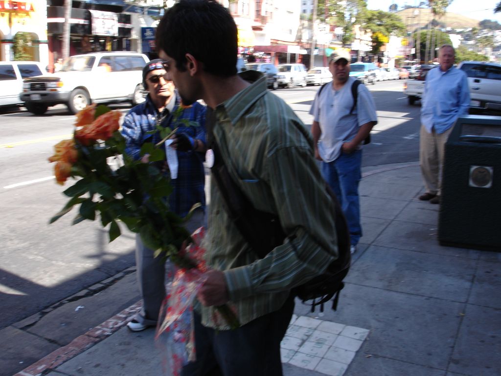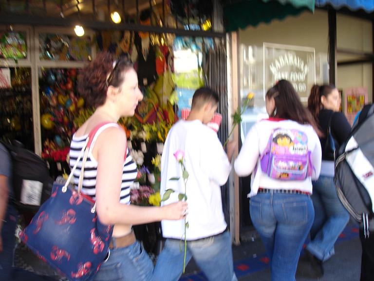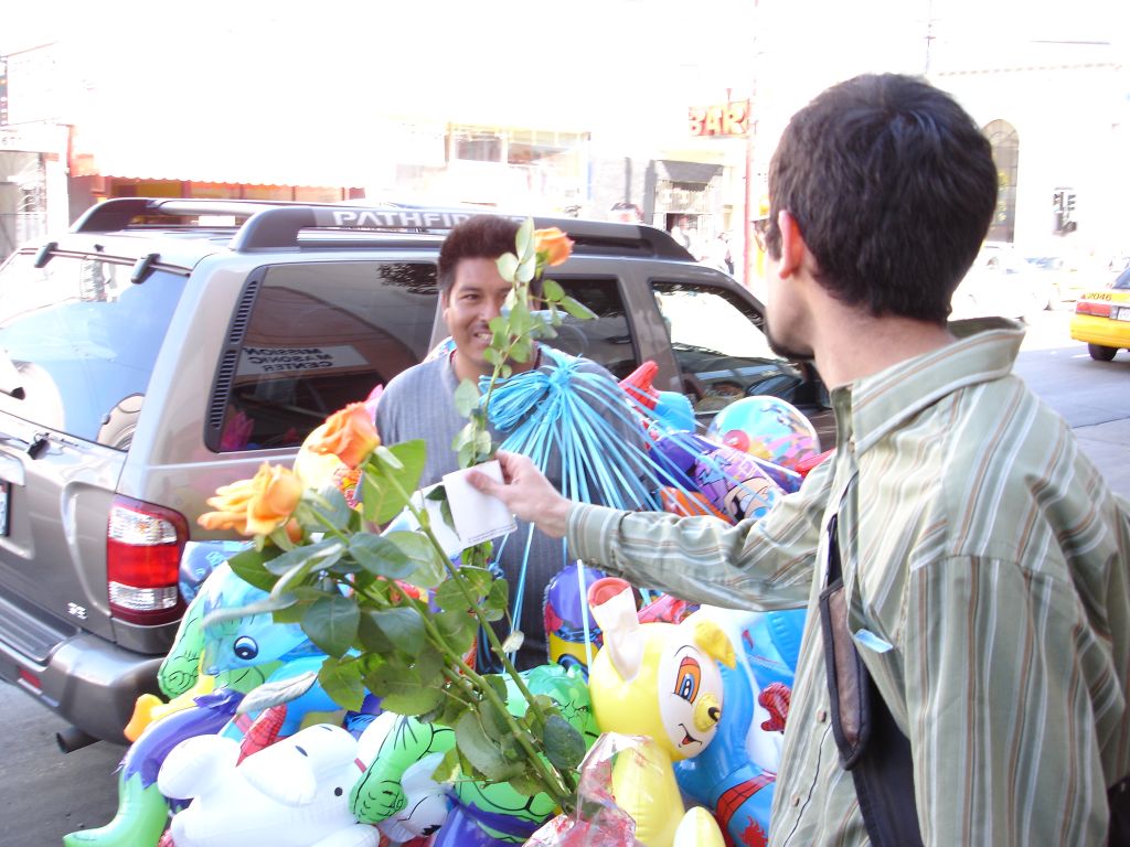 Kelly: While on a Long Walk, Rubin and i both decided it was a good time to give some flowers to random folks. like others who have completed this task, i found that many people refused my flowers, but this could be because they thought i was selling them, or because of a slight language barrier in a few cases... Anyways, some of the highlights for me were darting into a bus to give one to the bus driver (who was thrilled); being turned down by the balloon-carrying men (because the thorns would pop the balloons); the bouncer at the seedy bar who made a lewd comment to me and got a rose for his trouble; the two dudes in a parked car who actually yelled "i want a rose" at me (and were, of course, oblidged); and my personal fav: the really really angry crazy guy shaking his fist and yelling and cursing at the city in general, was, after we passed, yelling and shaking two roses at the city. (video to come, its pretty entertaining, but a little sad that even flowers couldn't cheer him up)