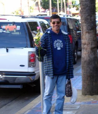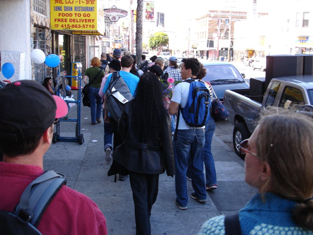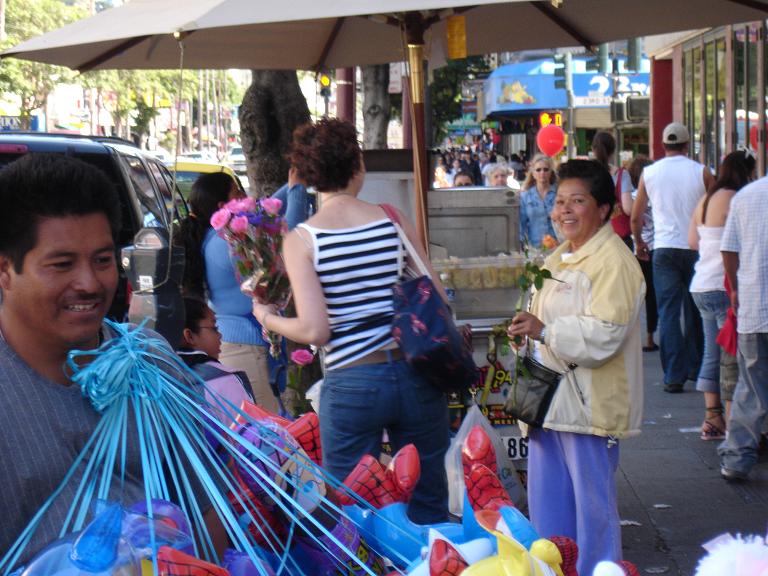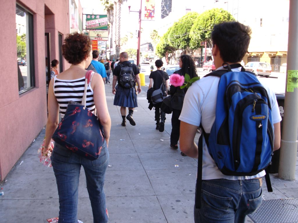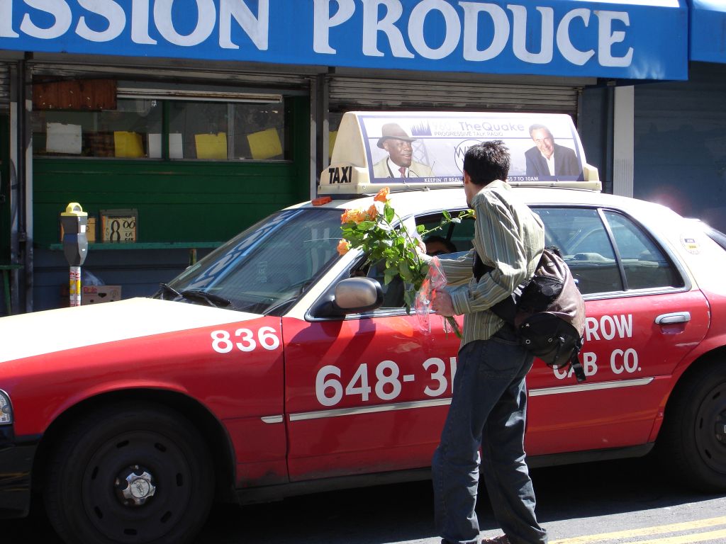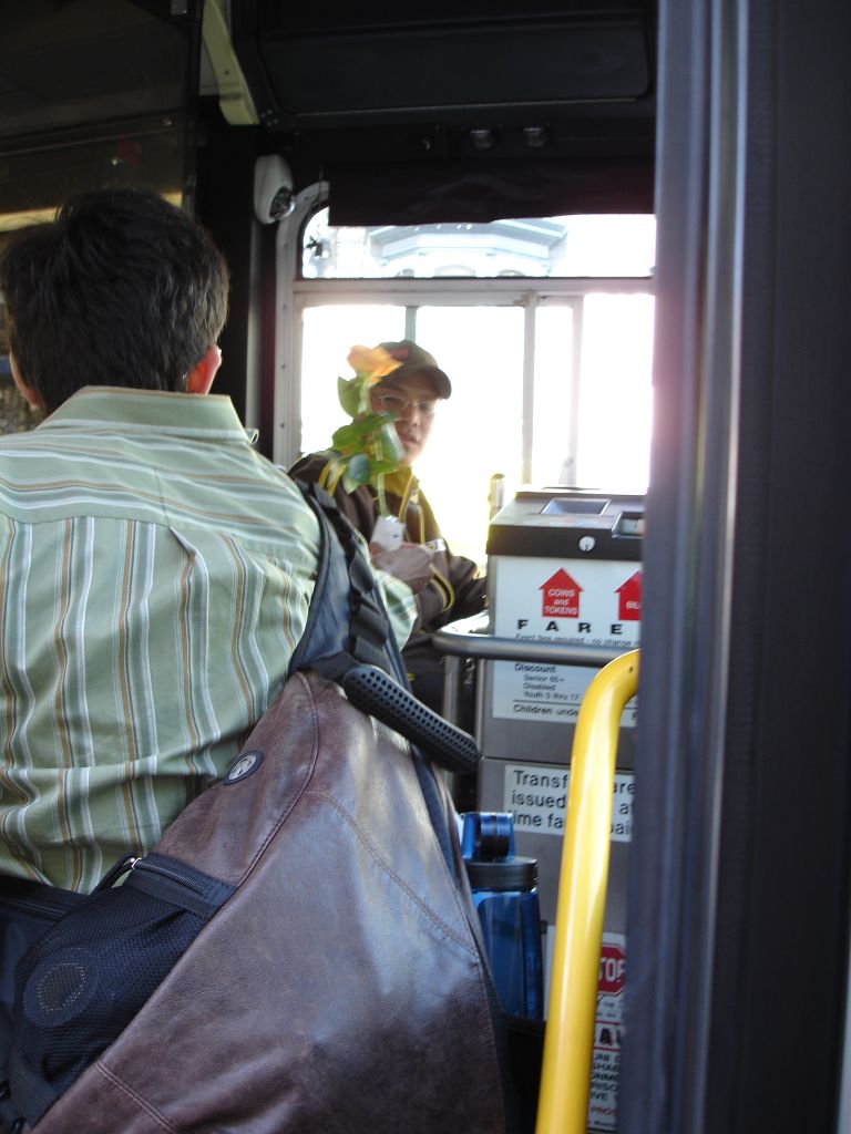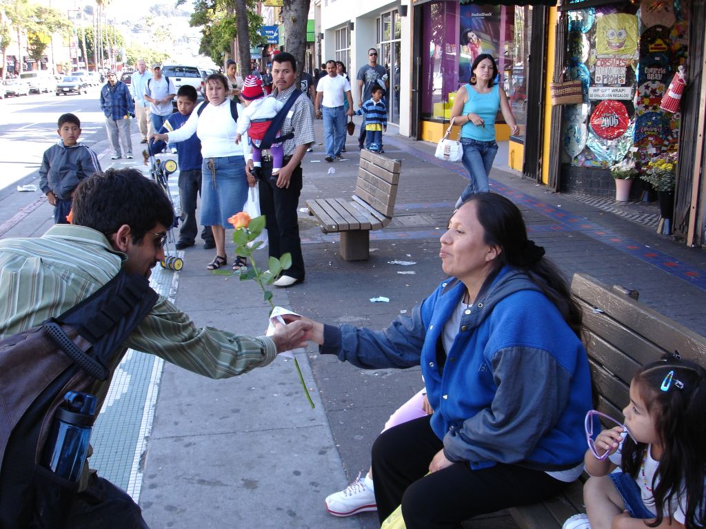 Kelly: While on a Long Walk, Rubin and i both decided it was a good time to give some flowers to random folks. like others who have completed this task, i found that many people refused my flowers, but this could be because they thought i was selling them, or because of a slight language barrier in a few cases... Anyways, some of the highlights for me were darting into a bus to give one to the bus driver (who was thrilled); being turned down by the balloon-carrying men (because the thorns would pop the balloons); the bouncer at the seedy bar who made a lewd comment to me and got a rose for his trouble; the two dudes in a parked car who actually yelled "i want a rose" at me (and were, of course, oblidged); and my personal fav: the really really angry crazy guy shaking his fist and yelling and cursing at the city in general, was, after we passed, yelling and shaking two roses at the city. (video to come, its pretty entertaining, but a little sad that even flowers couldn't cheer him up)