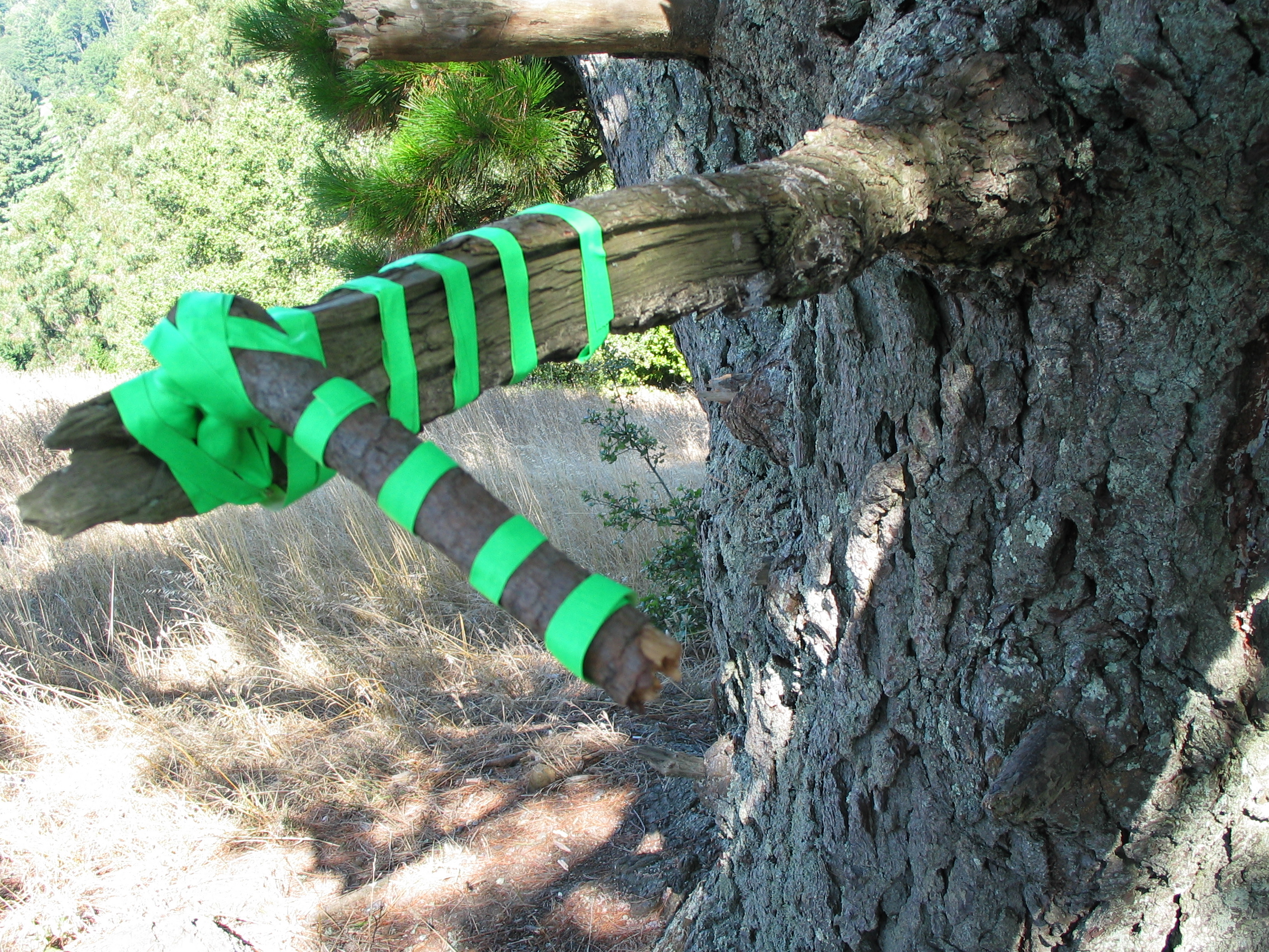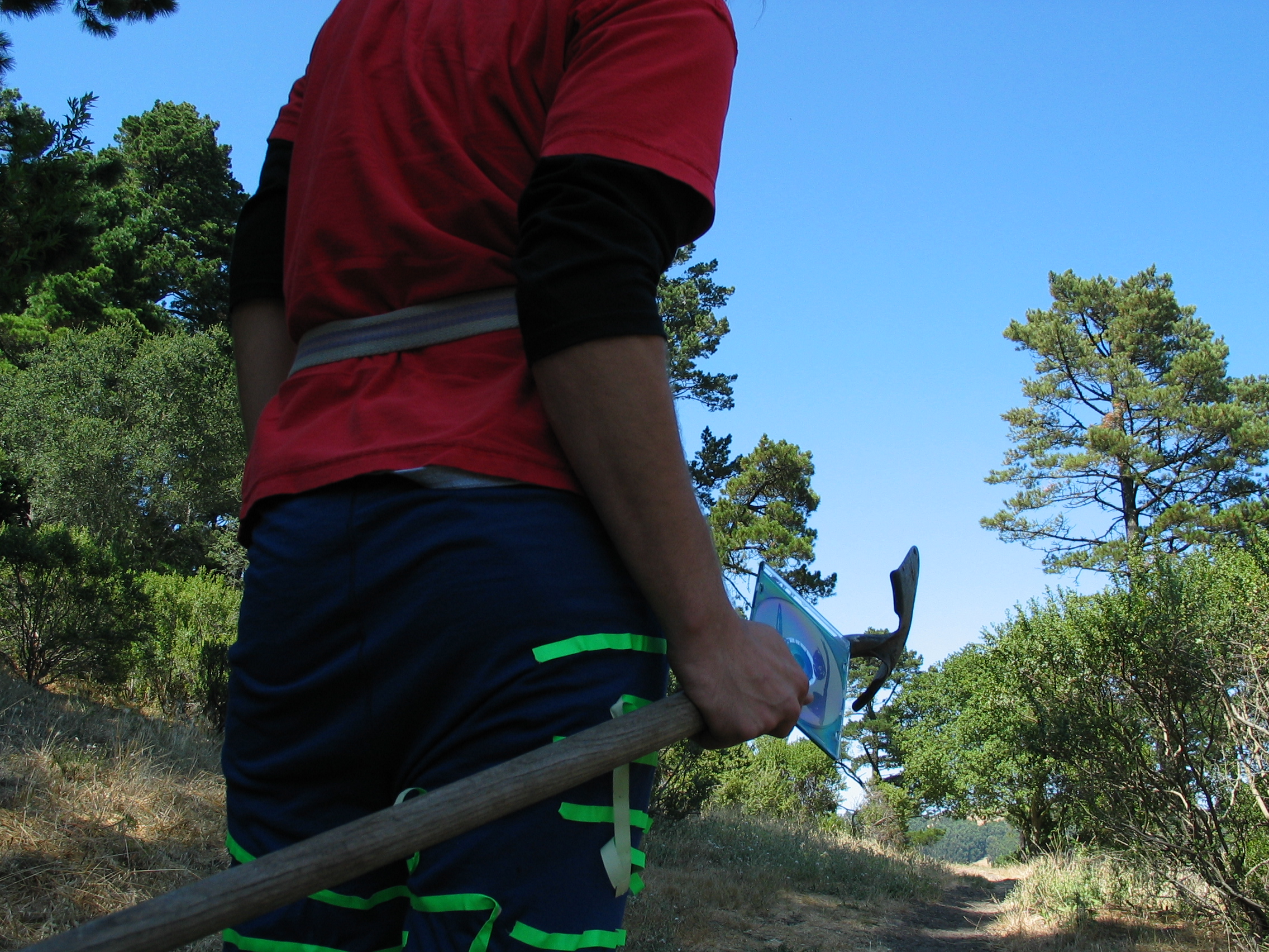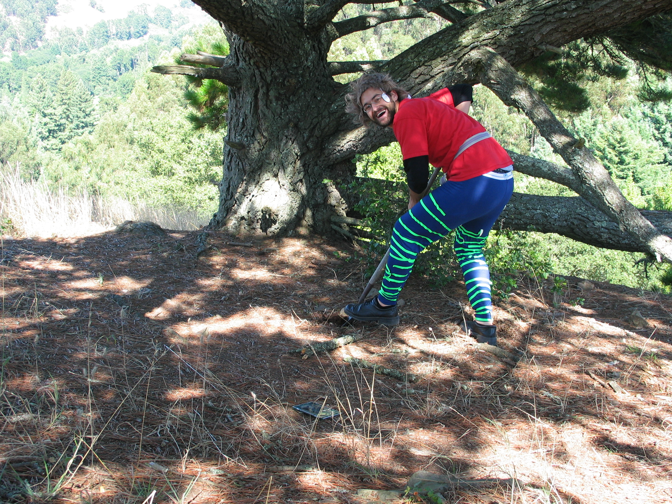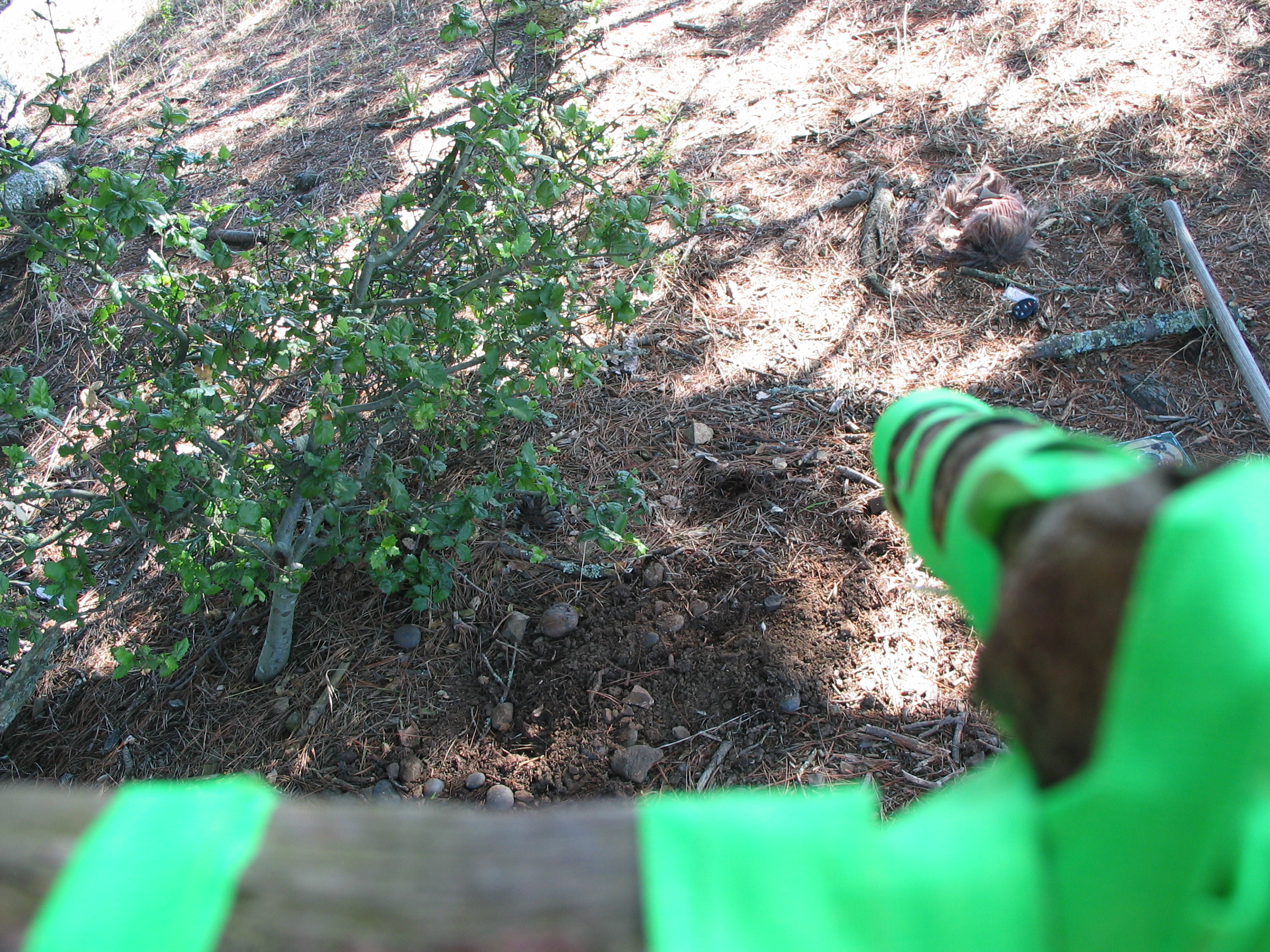 in the time since i had buried me treasure, the helpful green stripes and branch pointing to the secret hiding spot had gone away. completely. so we were digging everyplace. anywhere a branch pointed at the ground... i really really thought it was here.