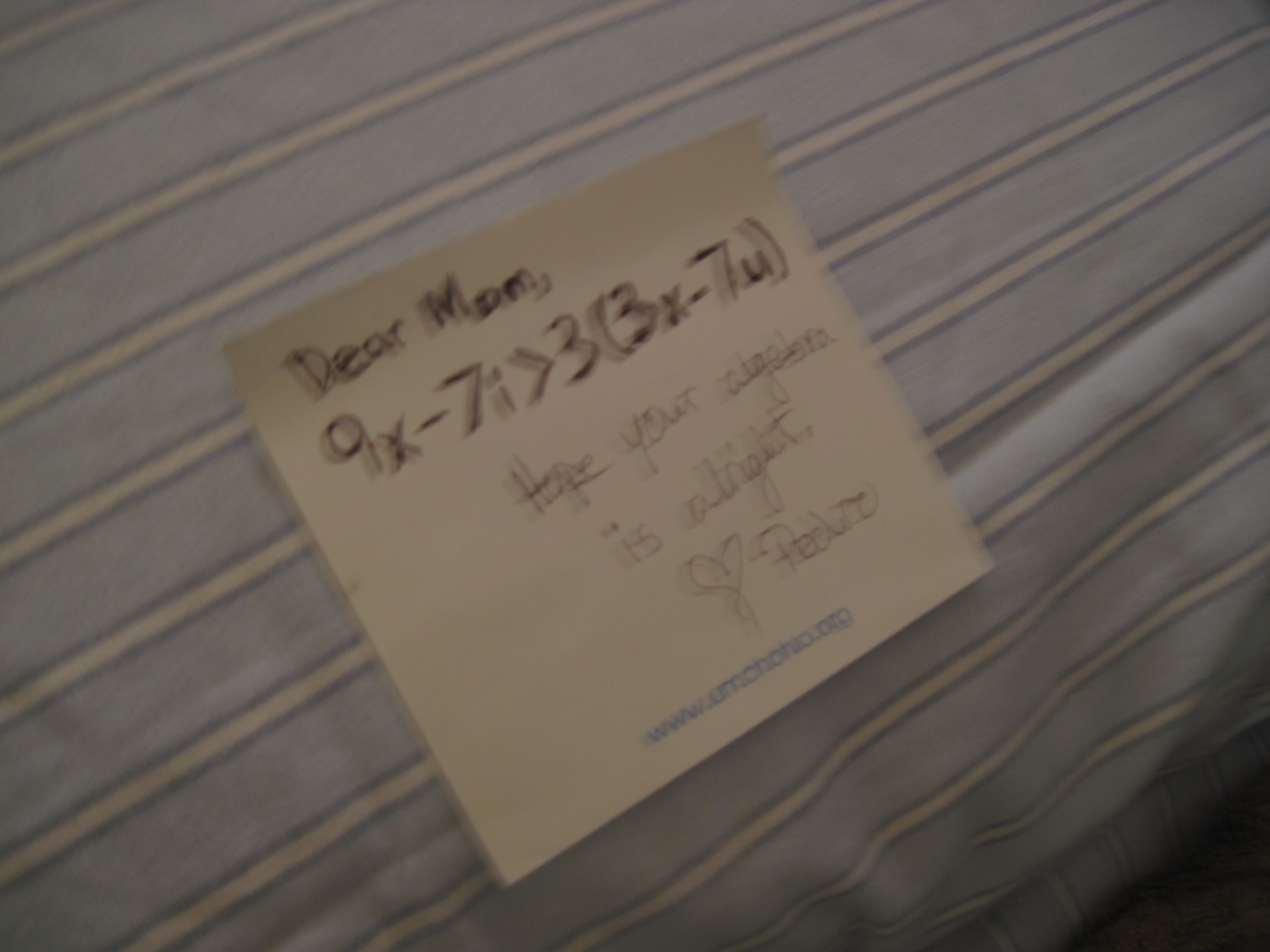 My mother is thinking of going back to school to work on her Masters of Social Work or a Masters of Forensic and Clinical Psychology. I remember that when I was in high school, asking her for math help was hopeless. So I felt obligated to let her know that I loved her in a mathematical form. When simplified, the equation goes from 9x-7i>3(3x-7u) to i<3u. Corny? Yes. True? of course!