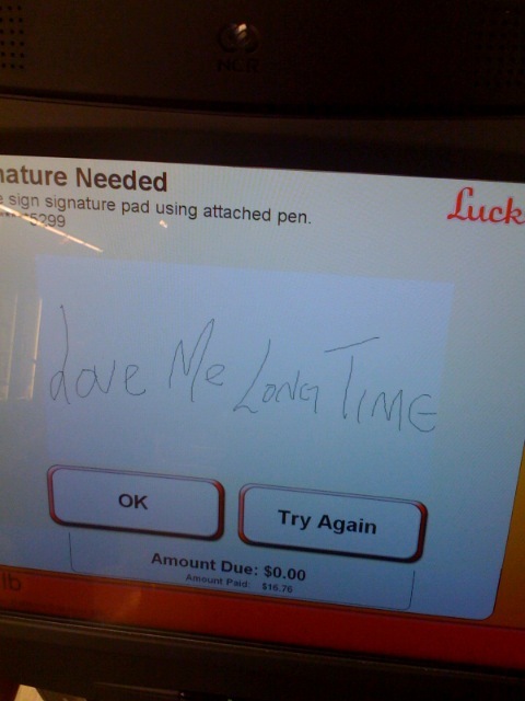 I wanted to leave a signature on a receipt somewhere unexpected. I took a trip to the local grocery store and went through the self check-out line. For those unaware, self check-out is regulated by an employee of the store from some place amongst the rest of the check-out lines. Their purpose is to watch people checking out on their own to make sure nothing is being stolen, or to assist people who have no idea what they're doing. Best of all, however, is that whenever you sign the bill using the credit card check-out, the "virtual" attendant sees your signature. So, here's what I did. It resulted in a very awkward stare.
