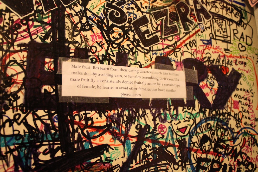 So, with its clean white paper background (100% recycled, I might add), my gleaming tidbit on fruit flies lies as an oasis of information in a sea of written noise. Diners can look up and learn a little bit more about fruit fly biology... and dating habits.