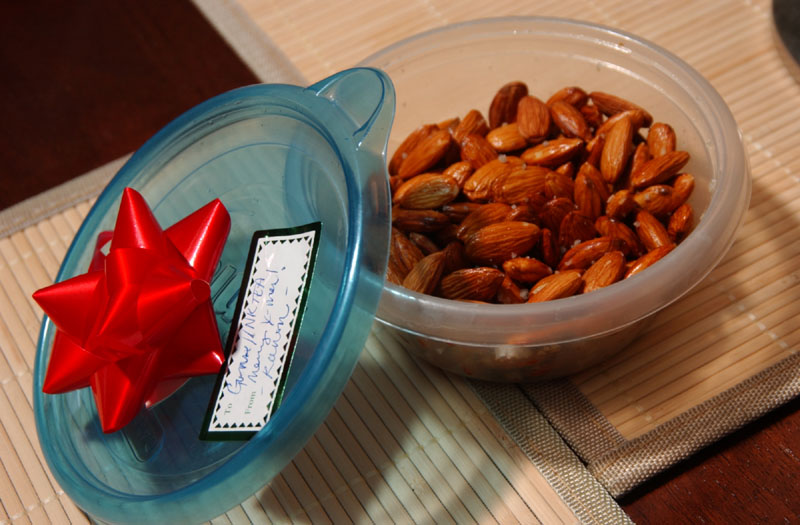 Raw organic almonds misted with olive oil and tossed with coarse celtic sea salt, made especially to celebrate Ink Tea's birthday at Oliver's party, and just to make the point clear, wrapped delightfully in a Christmas themed tag and bow, like a belated X-mas gift to be handed out at New Year's Eve. Boo-yeah.