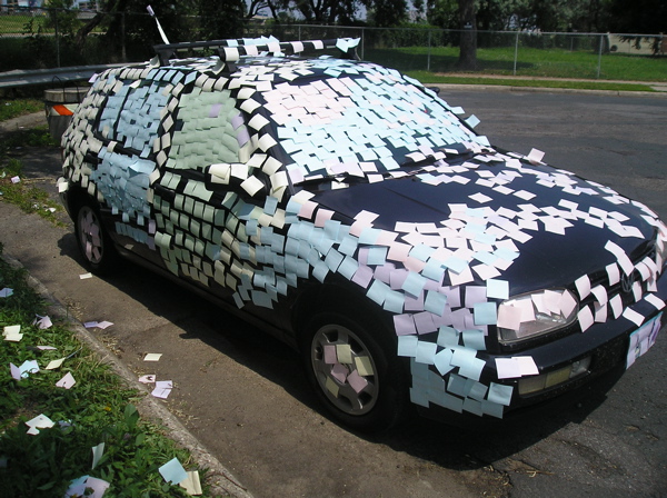 I was biking along a little used side street, and in a dead end cul-de-sac type place was parked a VW Jetta completely covered in post it notes. I am fascinated by post-its, I really really love them. I was also stoked when the Rake wrote a really good article about Post-its, so I feel that I have some post-it backround. I proceeeded without backup. The area around was pretty covered in post-it's as well, but it was a fabulous sight to see. While I was photgraphing it another car pulled up to ask me about all the post-its. I said I had no idea, I didn't do it, but I sure wished I had! There was one note on the drivers side door that said "Dunn Bros. It was great!" and that was it. I walked around the car a couple times and wrote some notes. I wrote sf0 on a couple, thinking that anyone who appreciated having 8 million post-its would appreciate sf0. I also wrote (mostly for Oliver) "love the dolphins, write by W.A.S.T.E." I have hopes that people will see my notes and be inspired to write their own notes too! Then this person will come out and there will be this amazing manifesto on their car written in post-its!