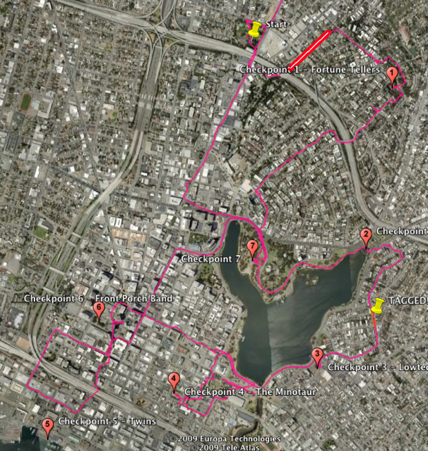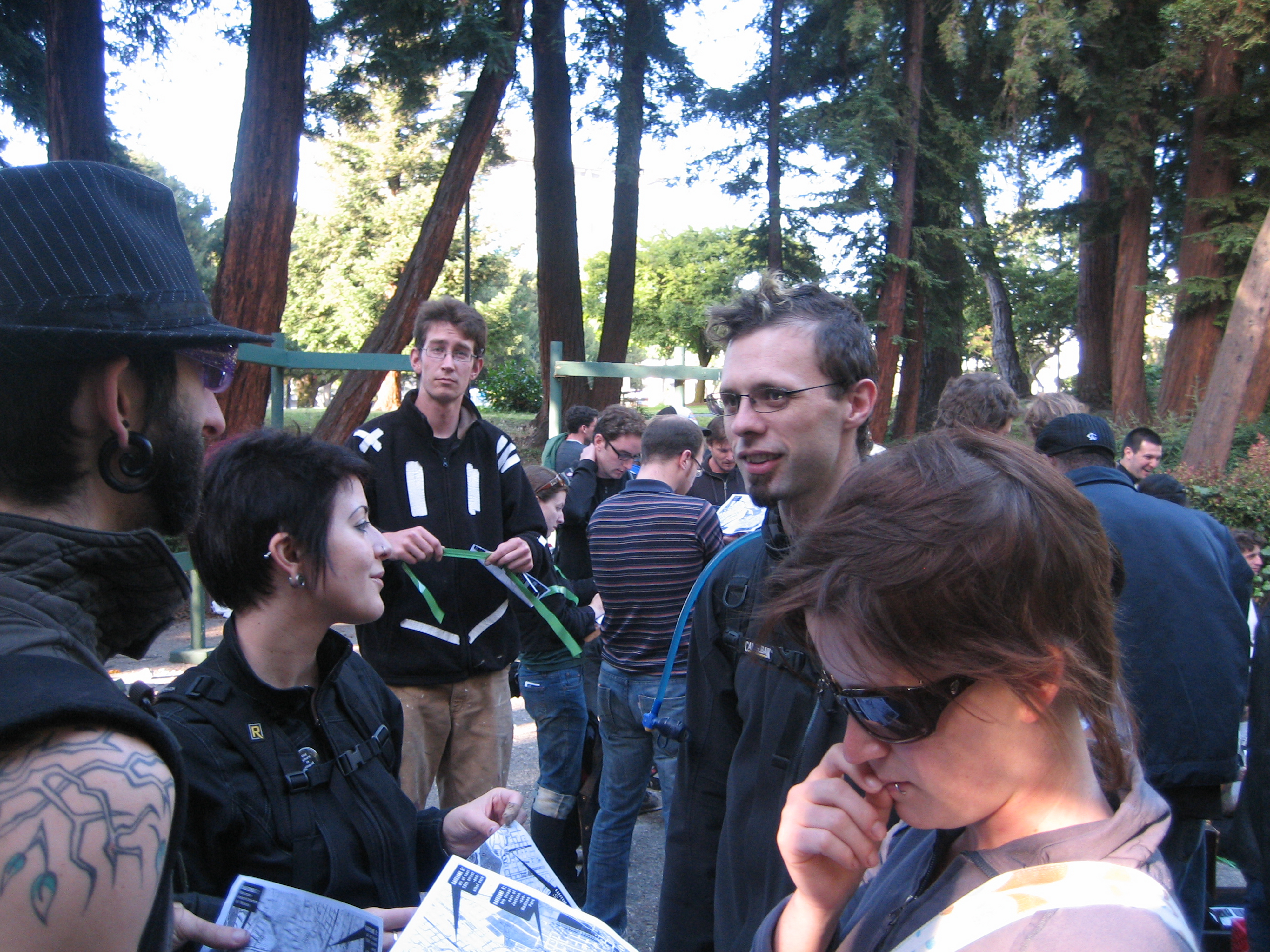 We met up with quite a few friends at Checkpoint 3, including the infamous Piratey Monkey. Many of them had been caught, but a decent number still had their green armbands and "were in it to win". Audrey and I wished them luck and then started wandering around Oakland trying to find players to catch.