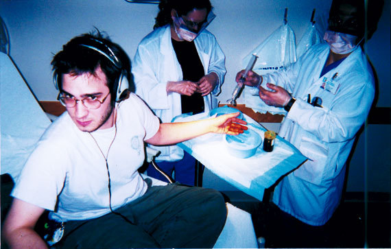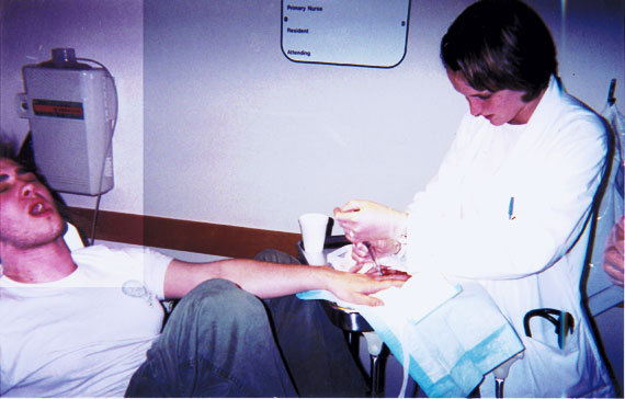 this is the part where the med student is putting a 12 gauge needle between my fingers and into the nerve bundle in the middle of my hand. funny thing about nerve bundles is they are really sensitive to being stabbed directly. this was easily the most painful moment of the night as i had no more adrenaline etc to take away what this actually felt like. a cool rush as fluid enters your body and blood....