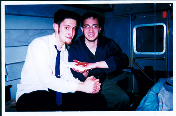 this is my friend who did it to me and me, in shock. we asked the paramedic for a picture. my friend had his camera.(this was after i got up, made some jokes and bled on the floor, went to the buildings security office and was like "i need an ambulance" and they were all "what's wrong" and i was all *shows them my hand*