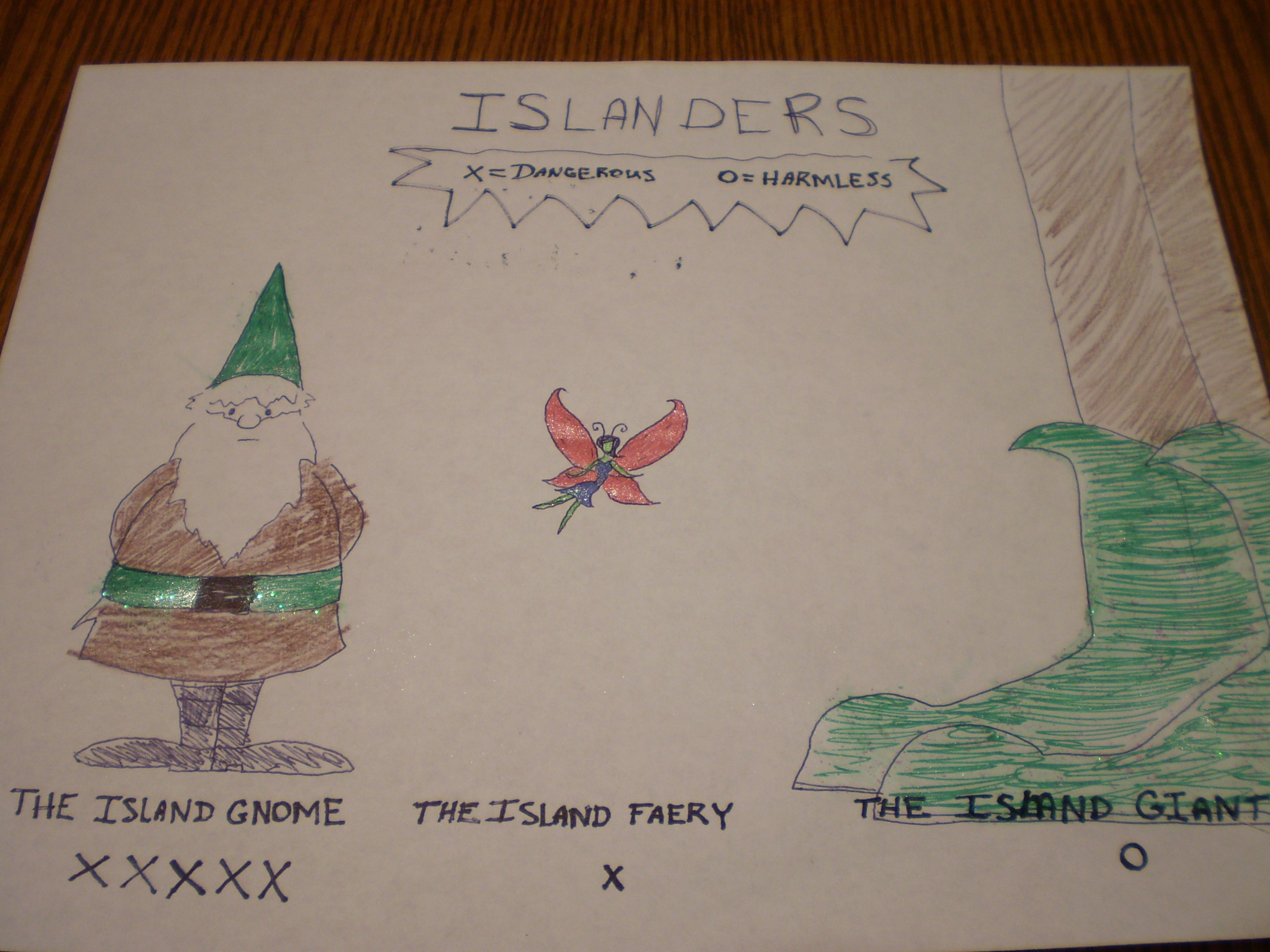 The creatures that live upon the islands include Faeries, Gnomes, and Giants, and Cubans. In the north section of the island is the Faery territory - there you will find landmarks such as Candy Castle and Hard Candy Cafe. On the east (and largest) portion of the mainland is the land of the Gnomes. Do not let these innocent-looking creatures fool you - they are by far the most dangerous creatures on the islands. They are known for being cannibalistic and for having a strong craving for human fingers. In their territory, you will find several locations best avoided - the Evil Water Vortex of Doom (located in a dark cove) sucks in anything and everything within a 10 mile radius. Another place best avoided is the Gnome Fortress. Rumored to contain vast treasures, this fortress is truly formidable to those who wish to enter it. Another hard-to-get-to hotspot is the Magic Meadow. Those who reach the meadow and eat of its magic mushrooms will reach great wisdom and physical beauty. Good luck trying to reach these mushrooms, for they are guarded by Glitter Monsters.