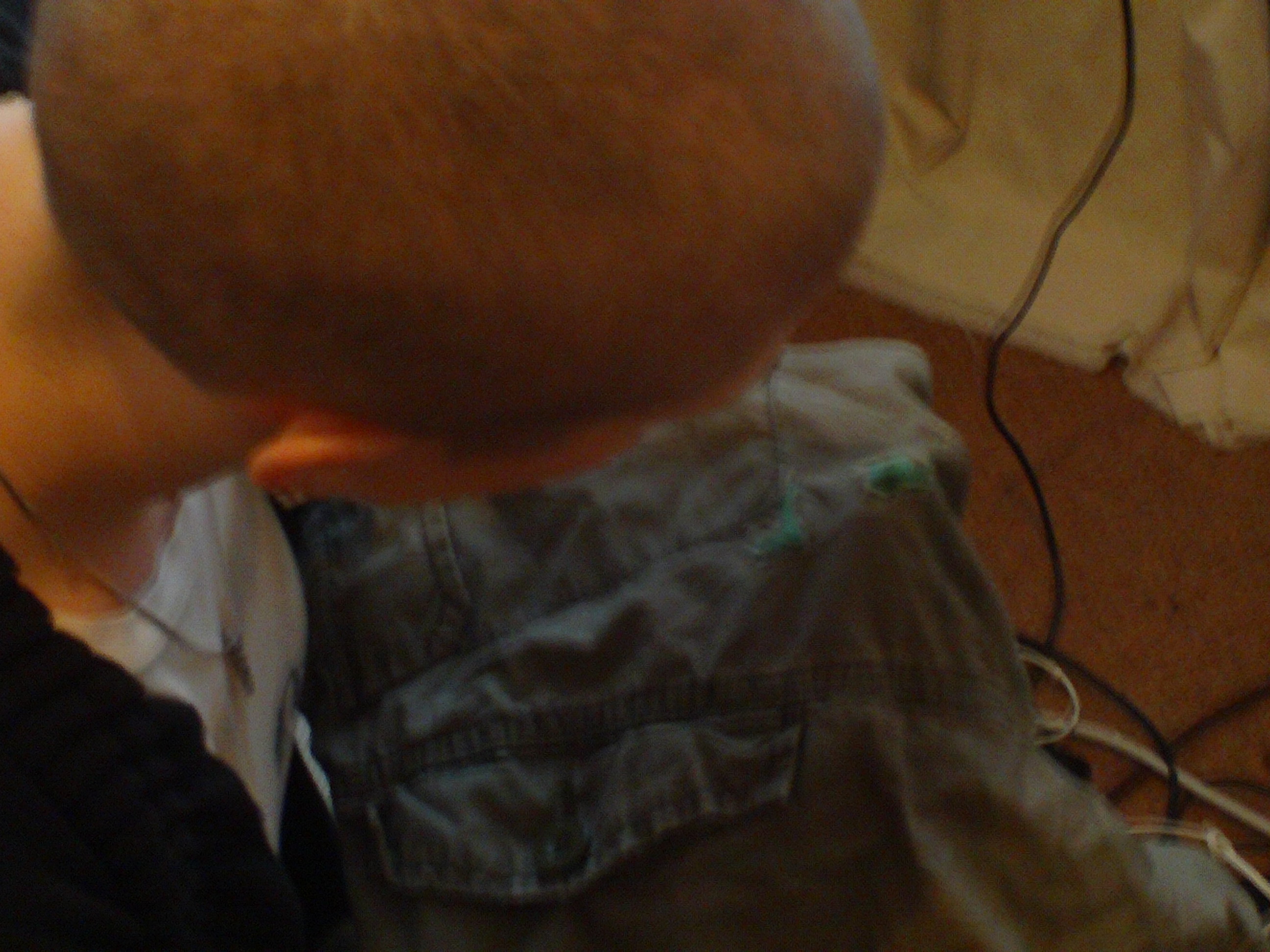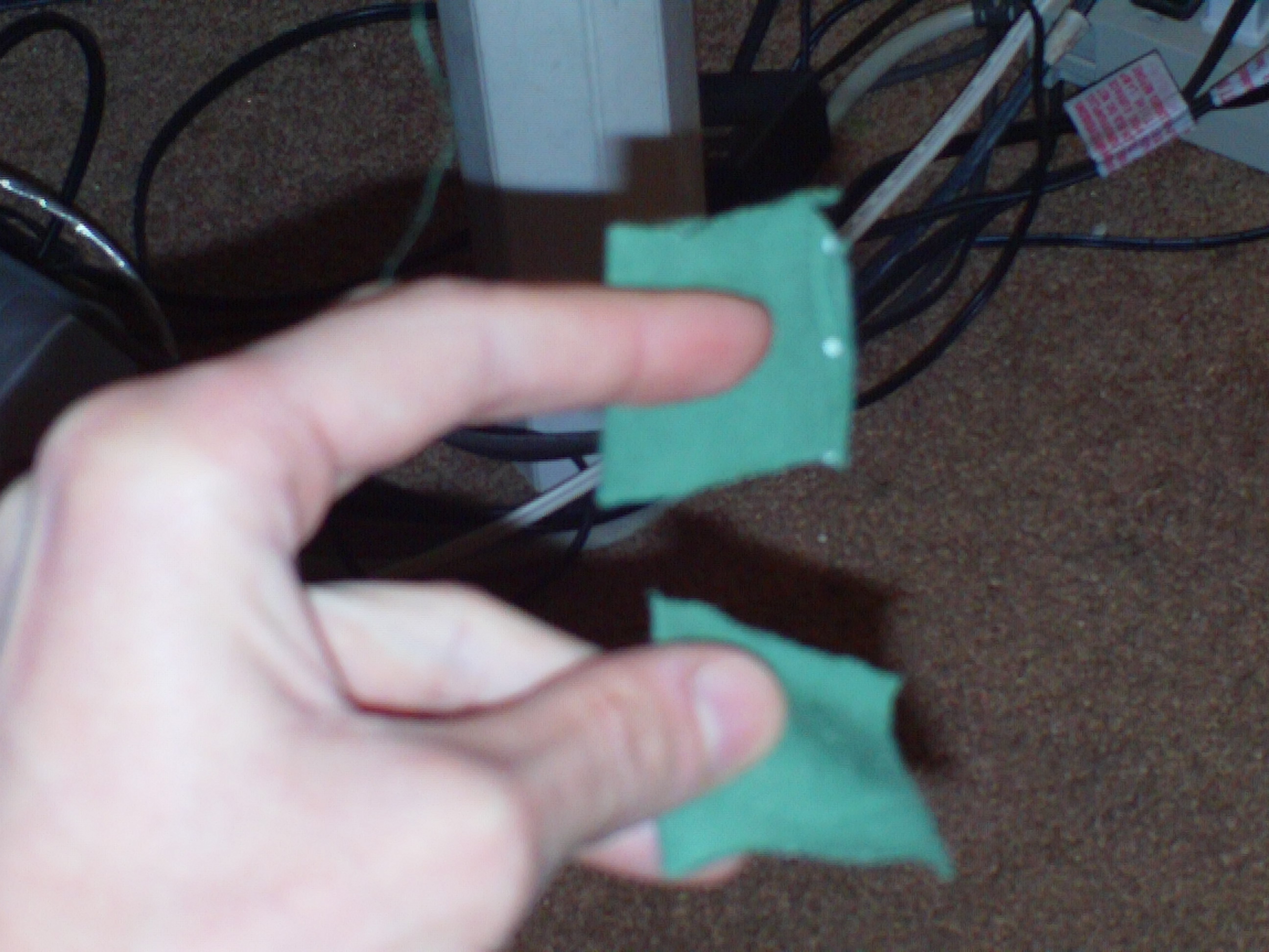 It took me an awful long time to patch the first hole. My first problem was holding the material to the pants while I stitched it in place. I used scotch tape to solve this problem. The overall process still took several hours, about as long as installing Windows 7 on my laptop.