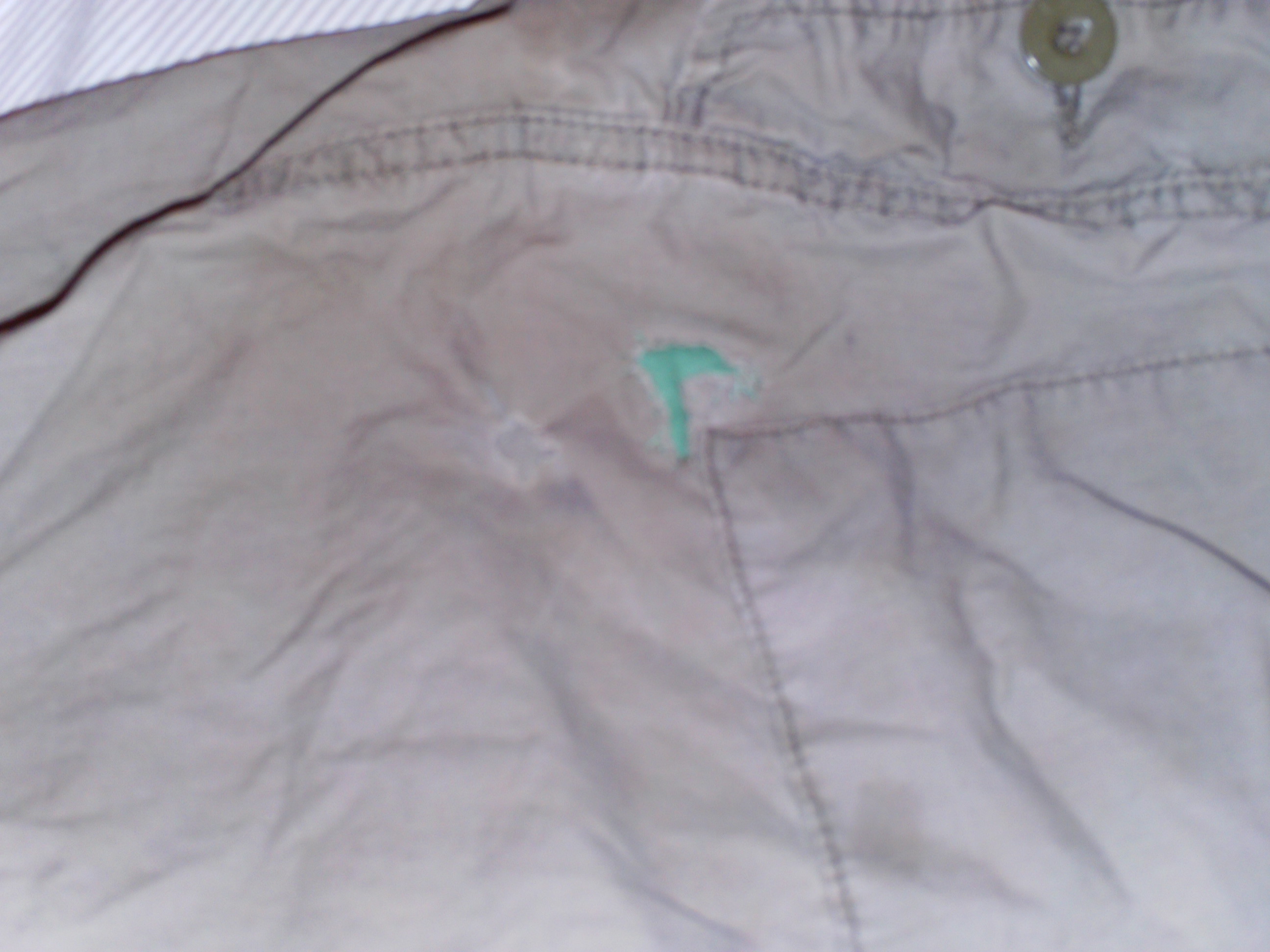 She did leave a pair of panties behind, and in the six months since our breakup she and I have not had any real contact, not even to swap the things we've left with each other. So now I'll use her abandoned clothing to undo the damage to my pants and make them wearable again.