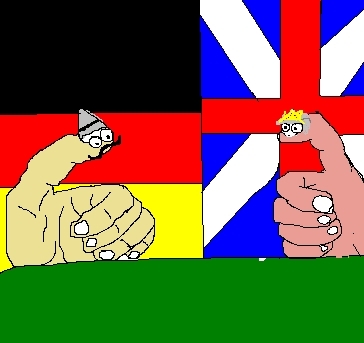 but i decided to draw a war that i declare, a thumb war between germany and england, with the queen fronting our side. and a steryotypical german fighter fighting theirs. go Queenie