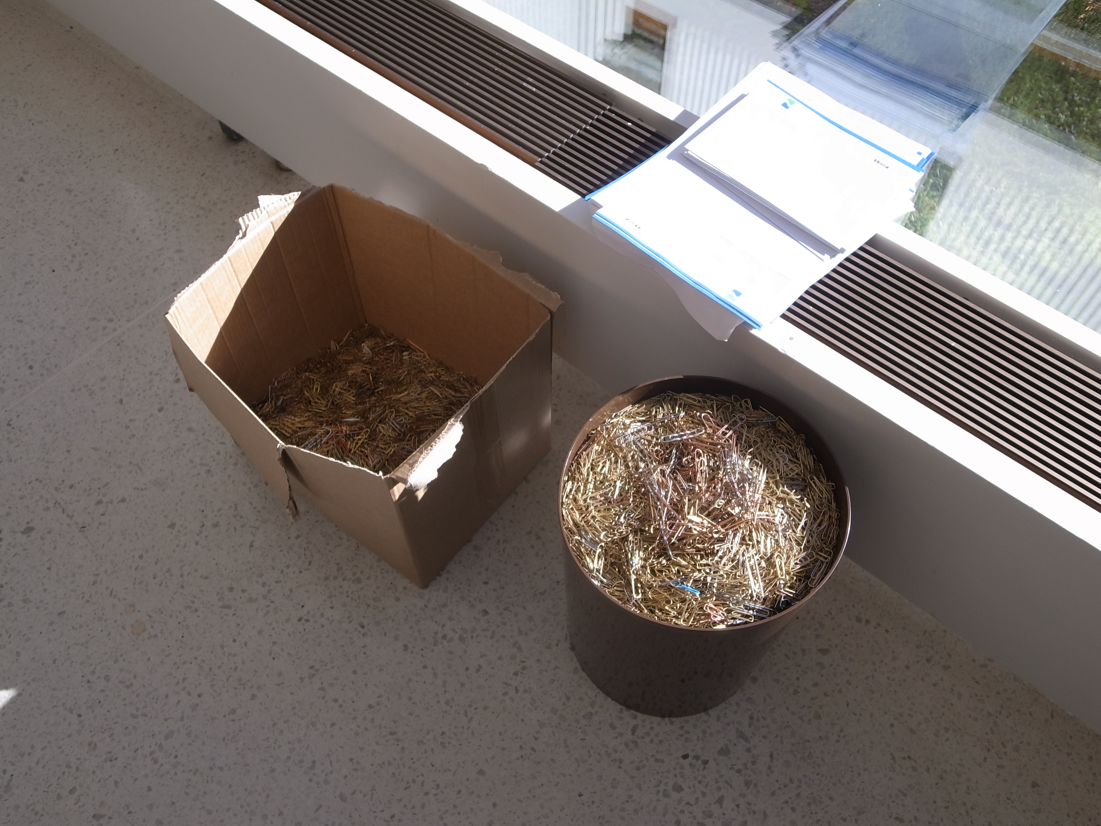 The buckets full of clips were eventually left in the foyer for employees to take a few. Which I did. You never know when the apocalypse cometh. (But if you happen to live in Norway and be in need of a few more bags of paper clips... or need to equip your next LARP team... it seems I have a bit of a surplus.)