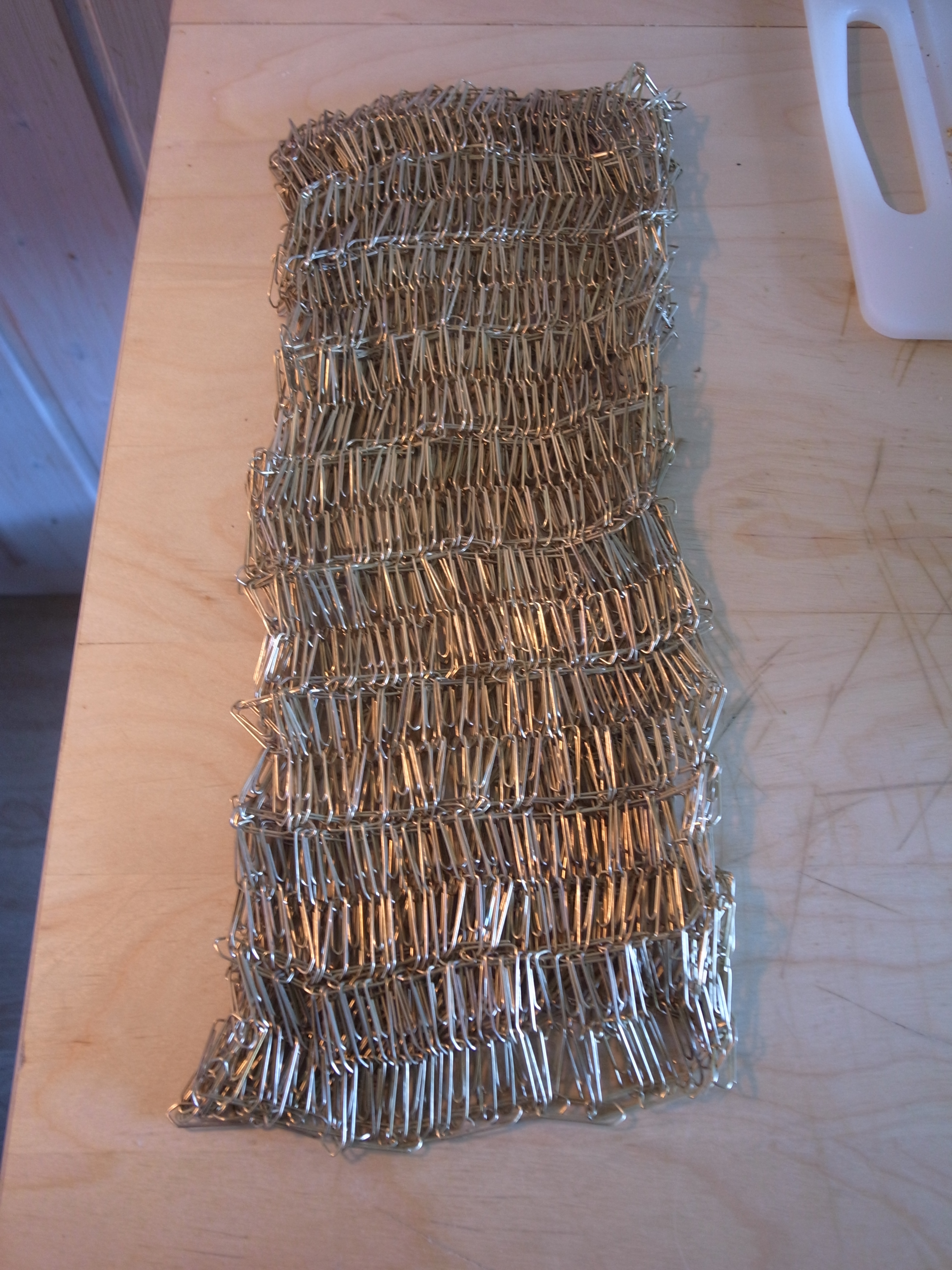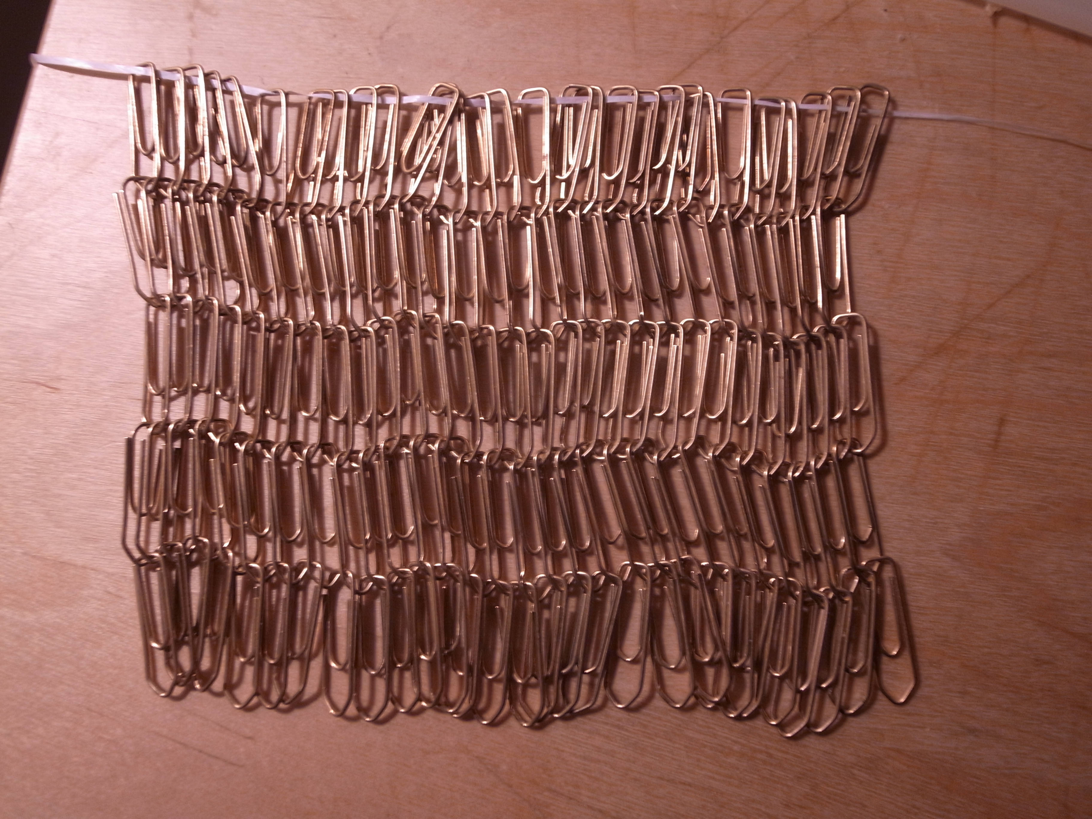 Blimey. So you will have to reinforce it, and make sure that it cannot extend too far. The easiest way to achieve this is by weaving in horizontal rows of tightly attached loops of even more paper clips.