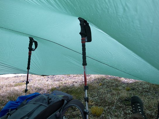The above combination saves me about 1kg on a tent, and yields either a tent or a hammock. This one sleeps two people with ease, possibly four.