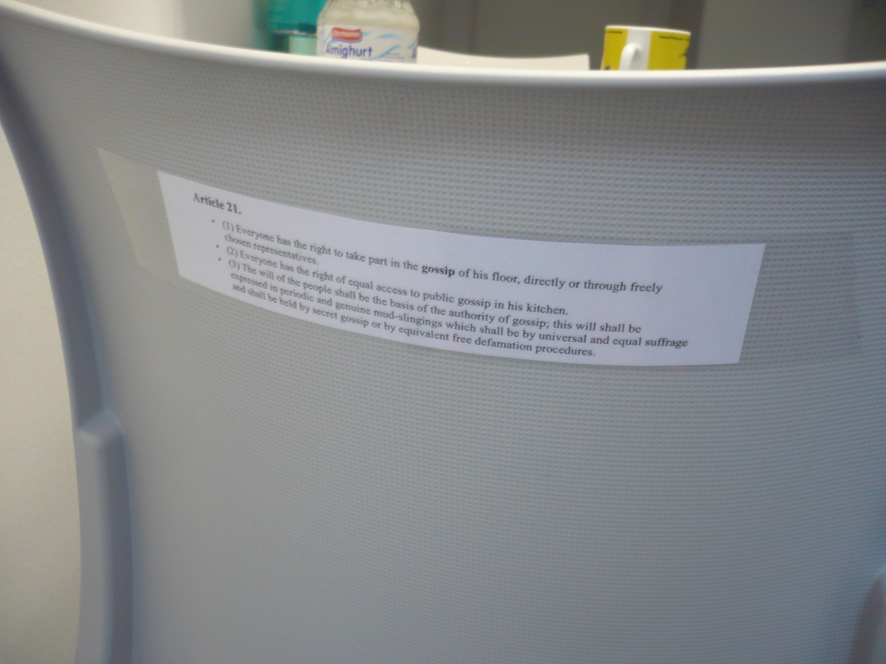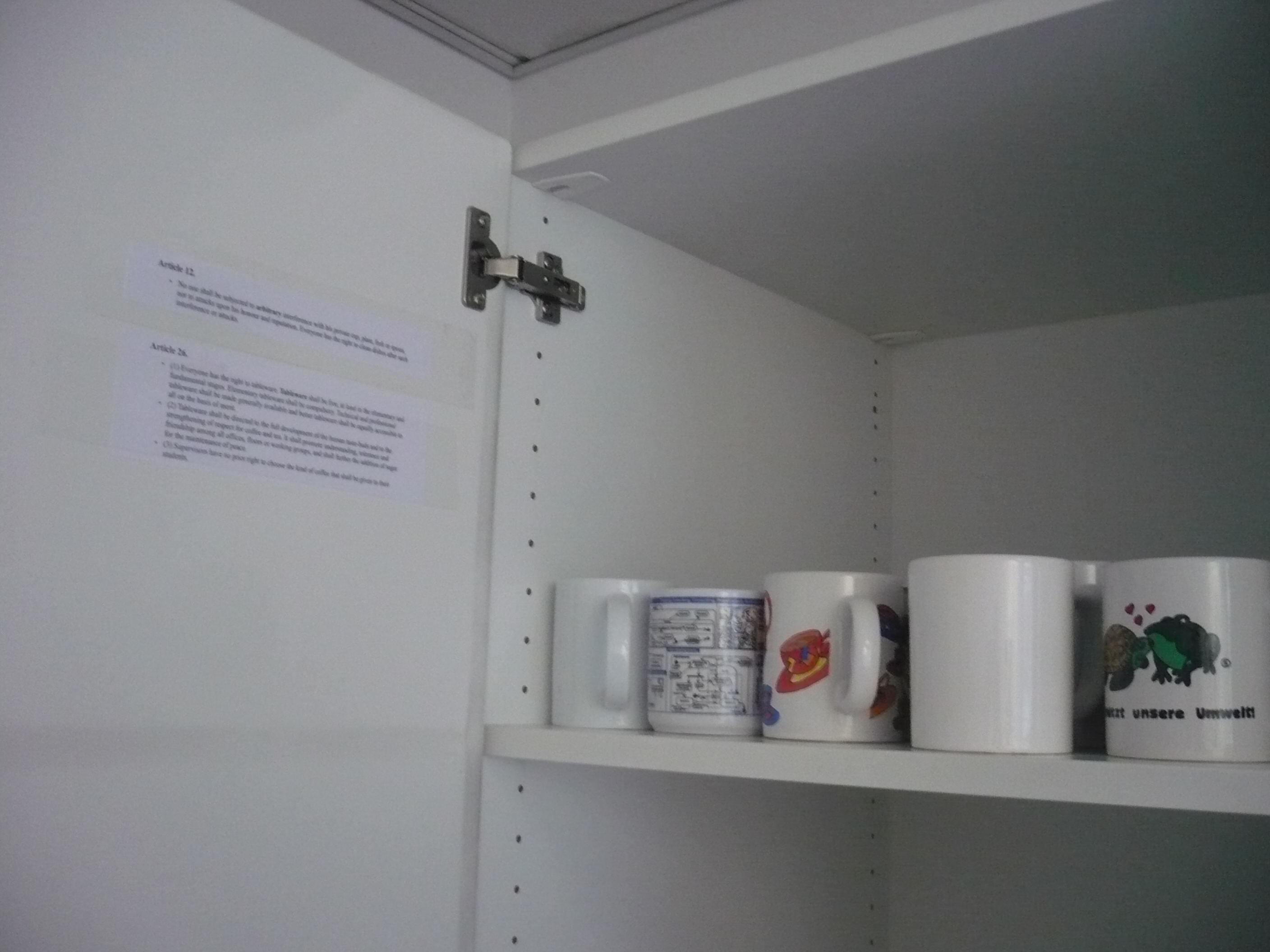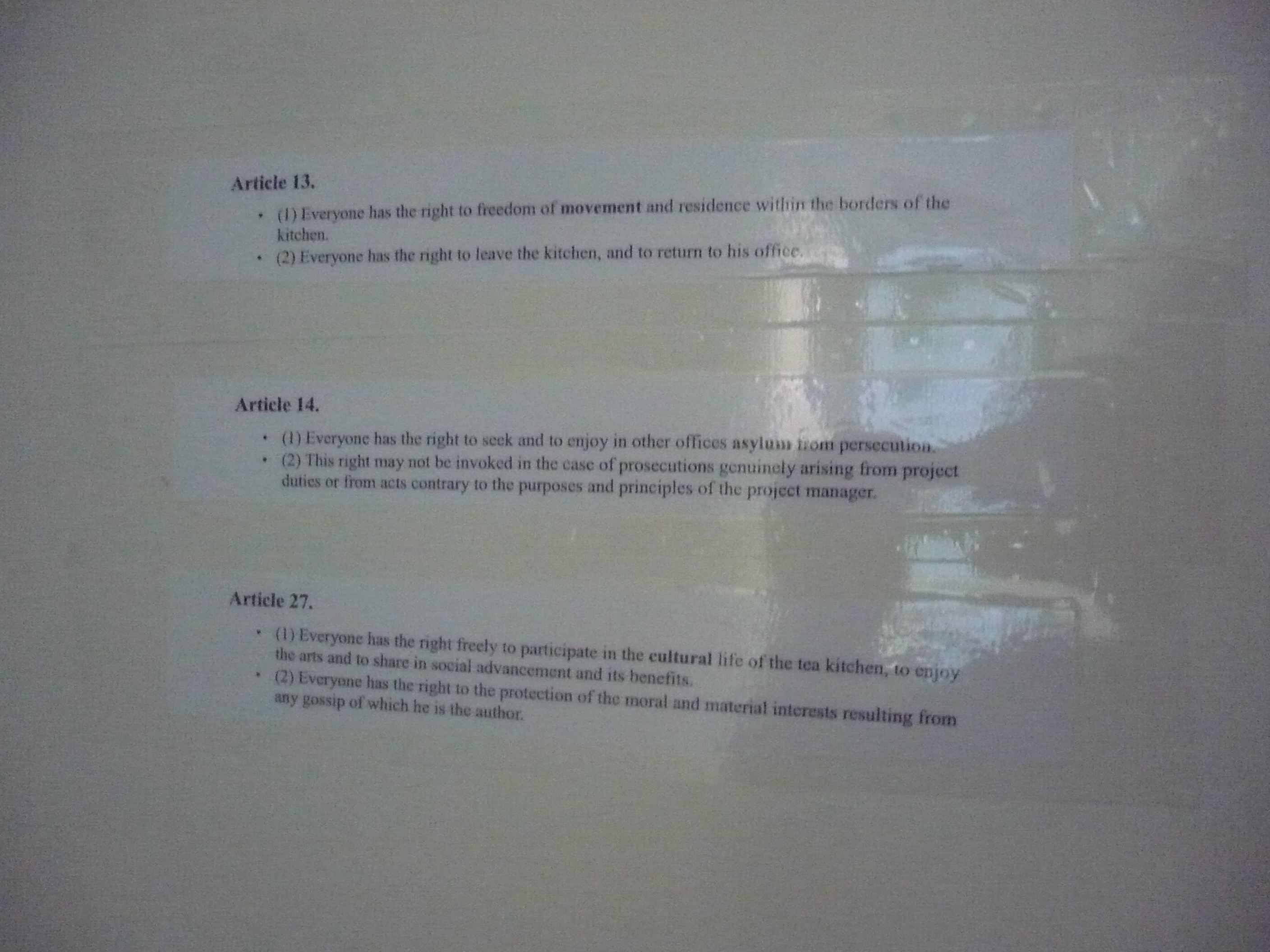 I have come up with the Universal Declaration of Tea Kitchen Rights. Or something along these lines. I have cut up the declaration, and glued each of the -slightly modified- articles in a place, where they might stop a mindless waterfetcher or cupborrower in his tracks. He might smile. He might think "Hey, I know that text. What was the original wording again? Maybe the other bits of paper here in the room will give me a clue..."
