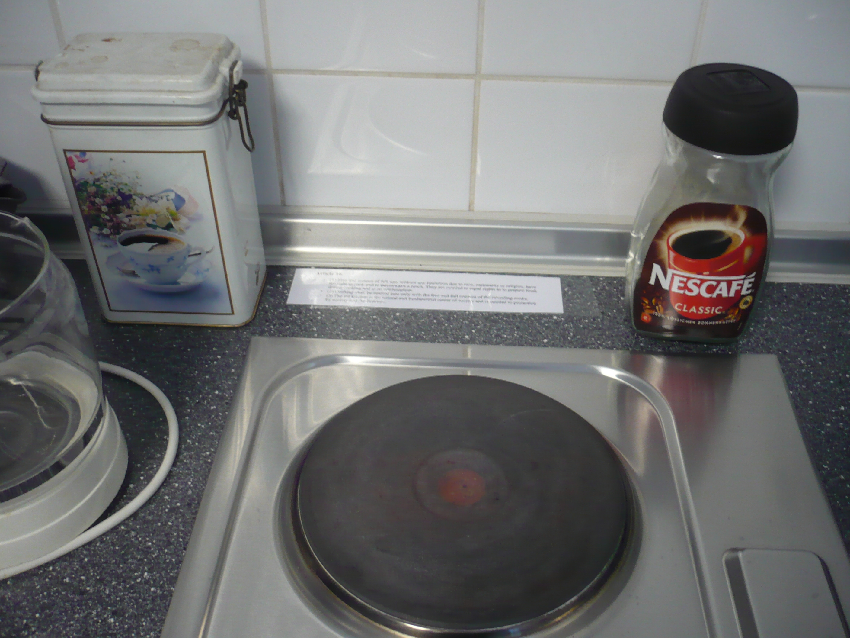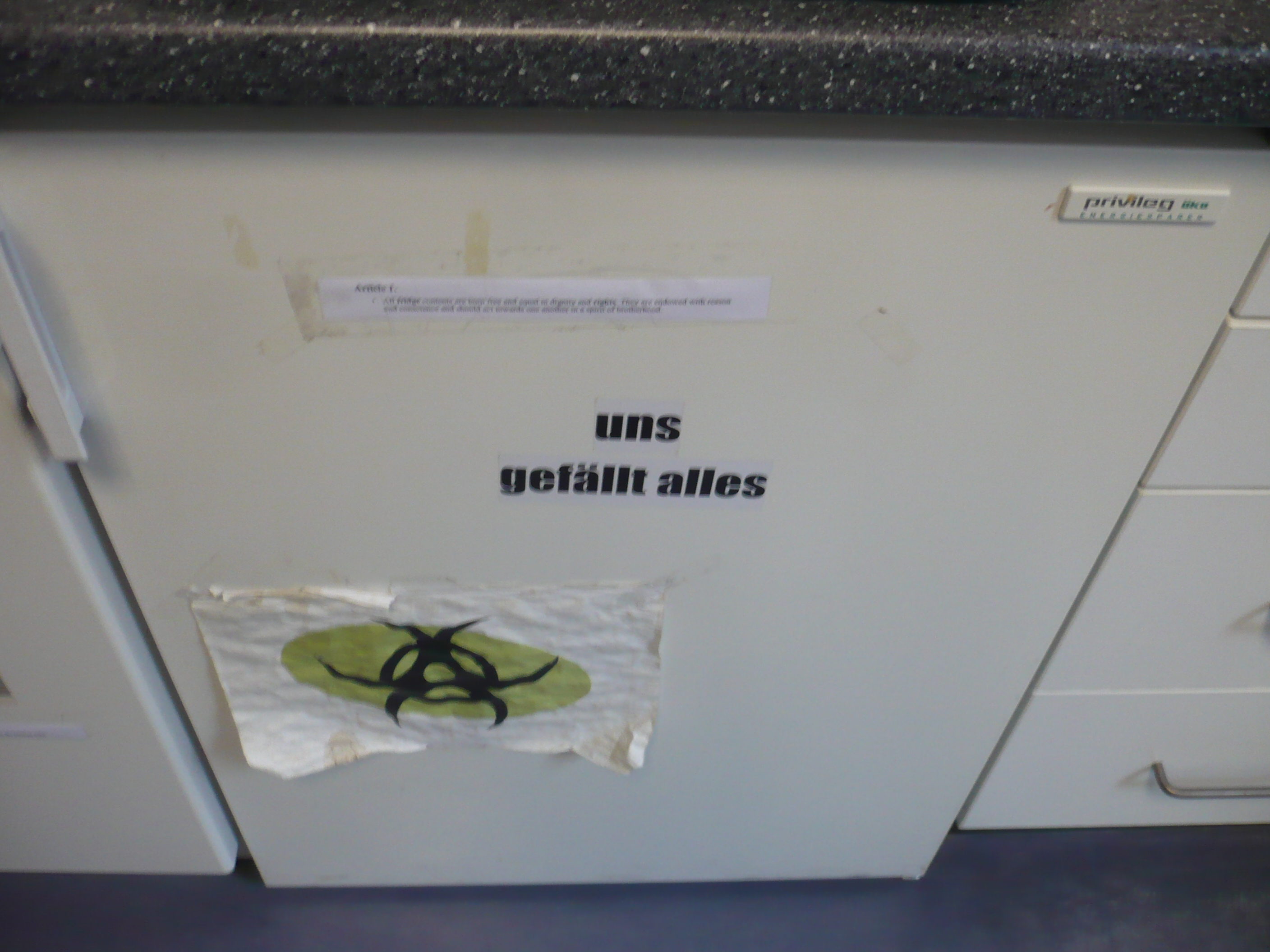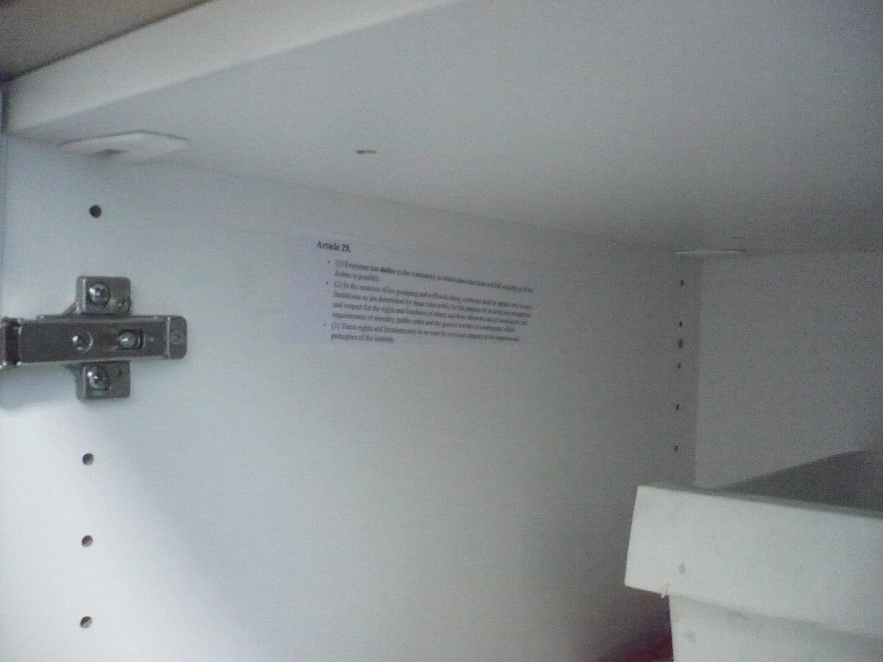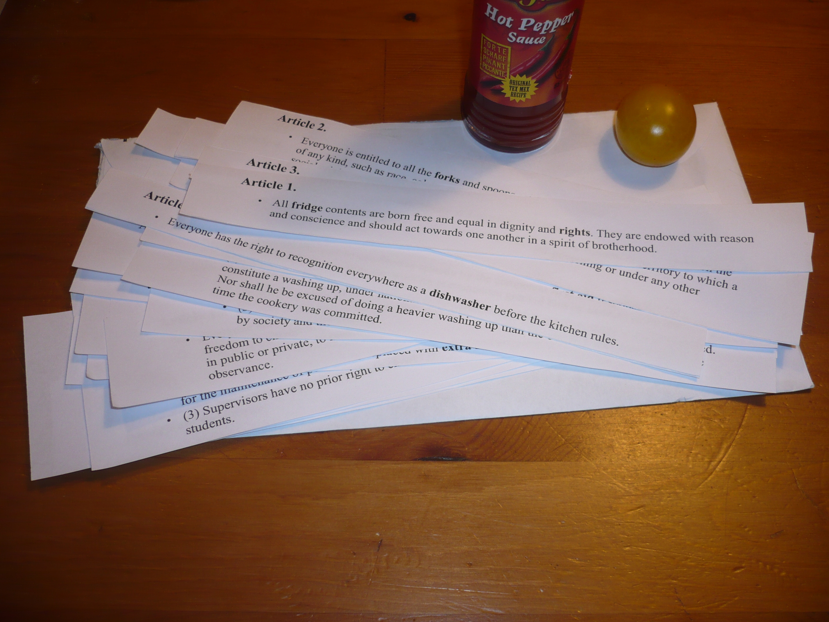 I have come up with the Universal Declaration of Tea Kitchen Rights. Or something along these lines. I have cut up the declaration, and glued each of the -slightly modified- articles in a place, where they might stop a mindless waterfetcher or cupborrower in his tracks. He might smile. He might think "Hey, I know that text. What was the original wording again? Maybe the other bits of paper here in the room will give me a clue..."