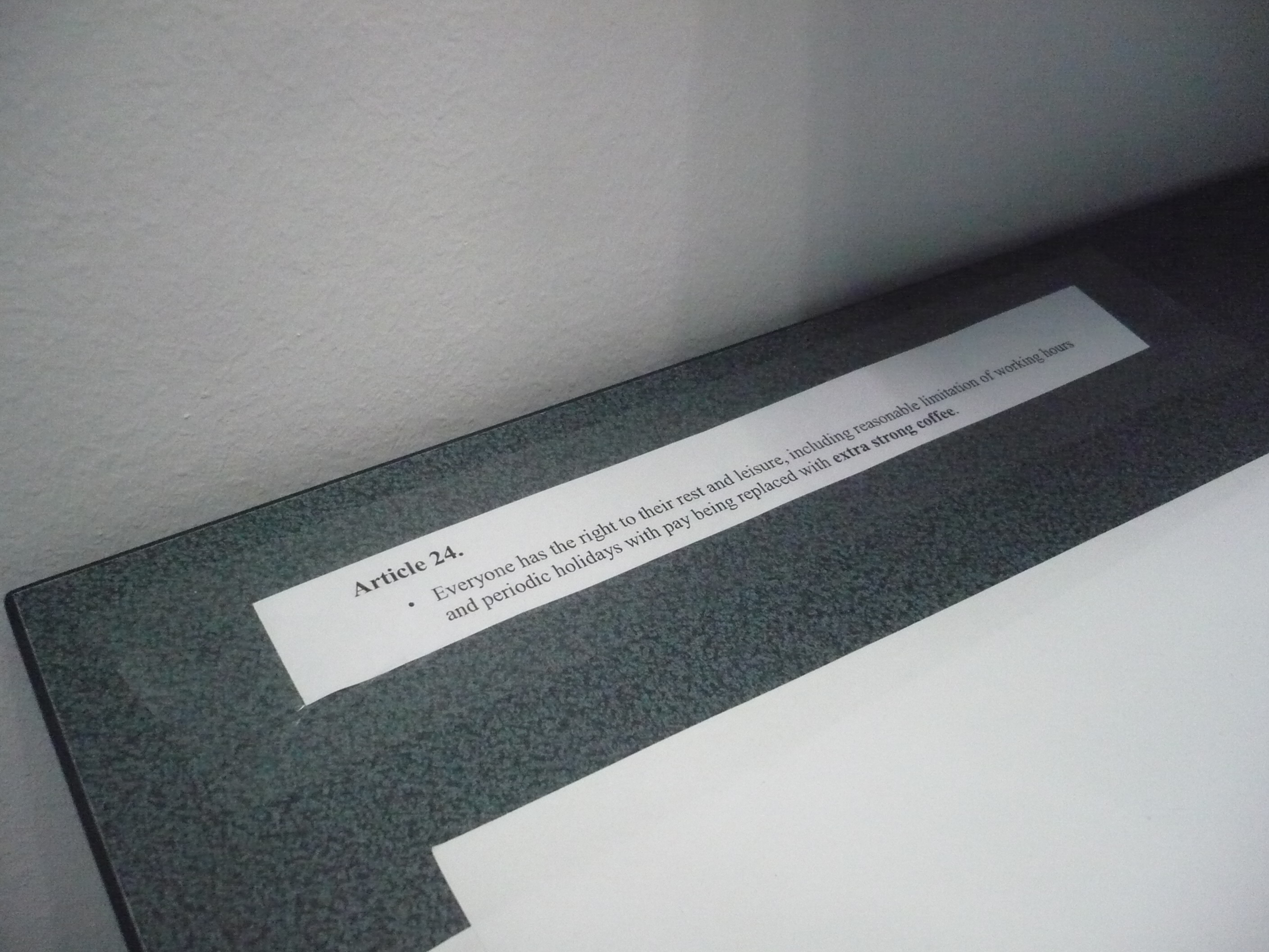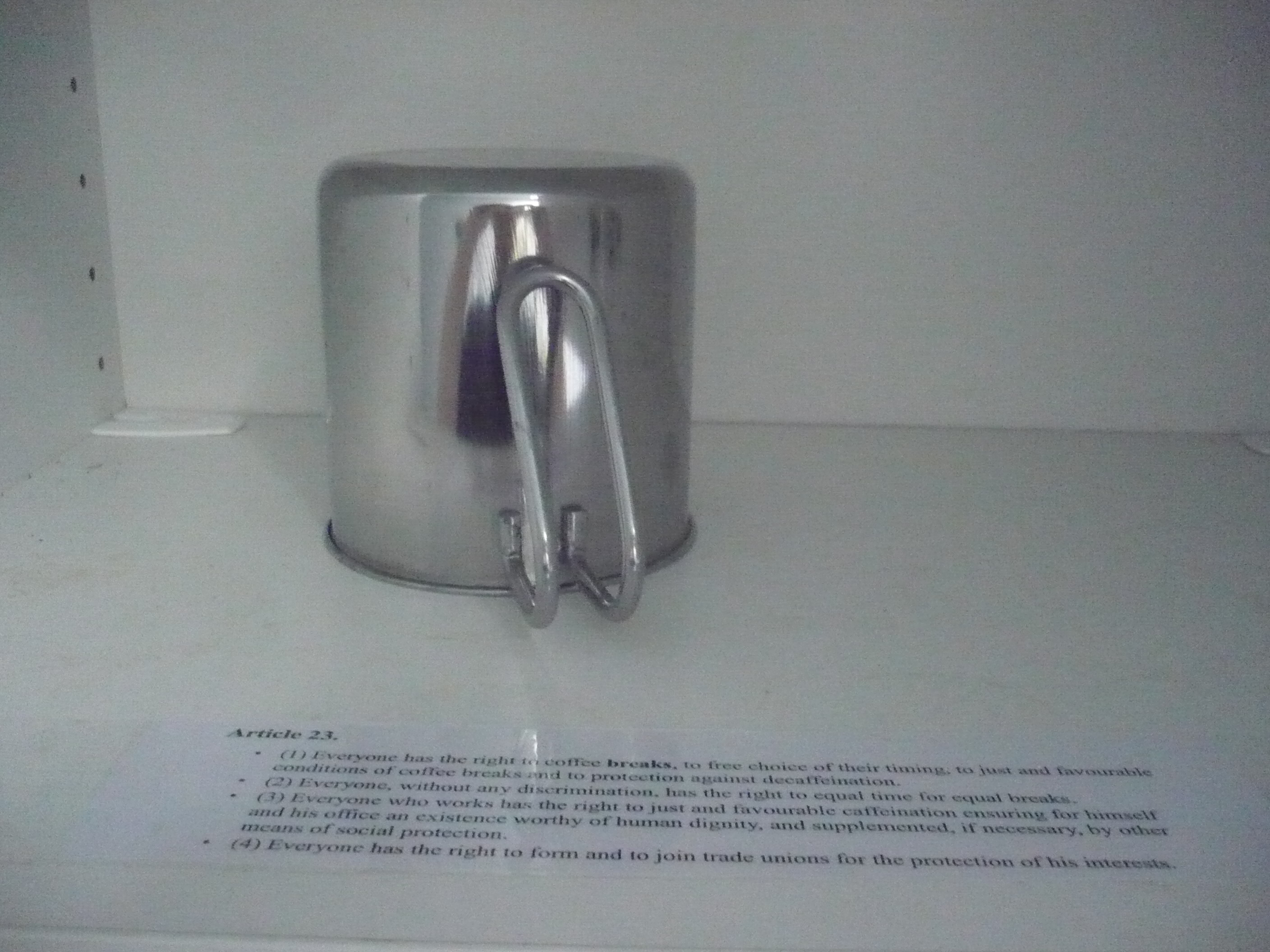 (1) Everyone has the right to coffee breaks, to free choice of their timing, to just and favourable conditions of coffee breaks and to protection against decaffeination. (2) Everyone, without any discrimination, has the right to equal time for equal breaks. (3) Everyone who works has the right to just and favourable caffeination ensuring for himself and his office an existence worthy of human dignity, and supplemented, if necessary, by other means of social protection. (4) Everyone has the right to form and to join trade unions for the protection of his interests. [in an empty drawer with a milk pot]