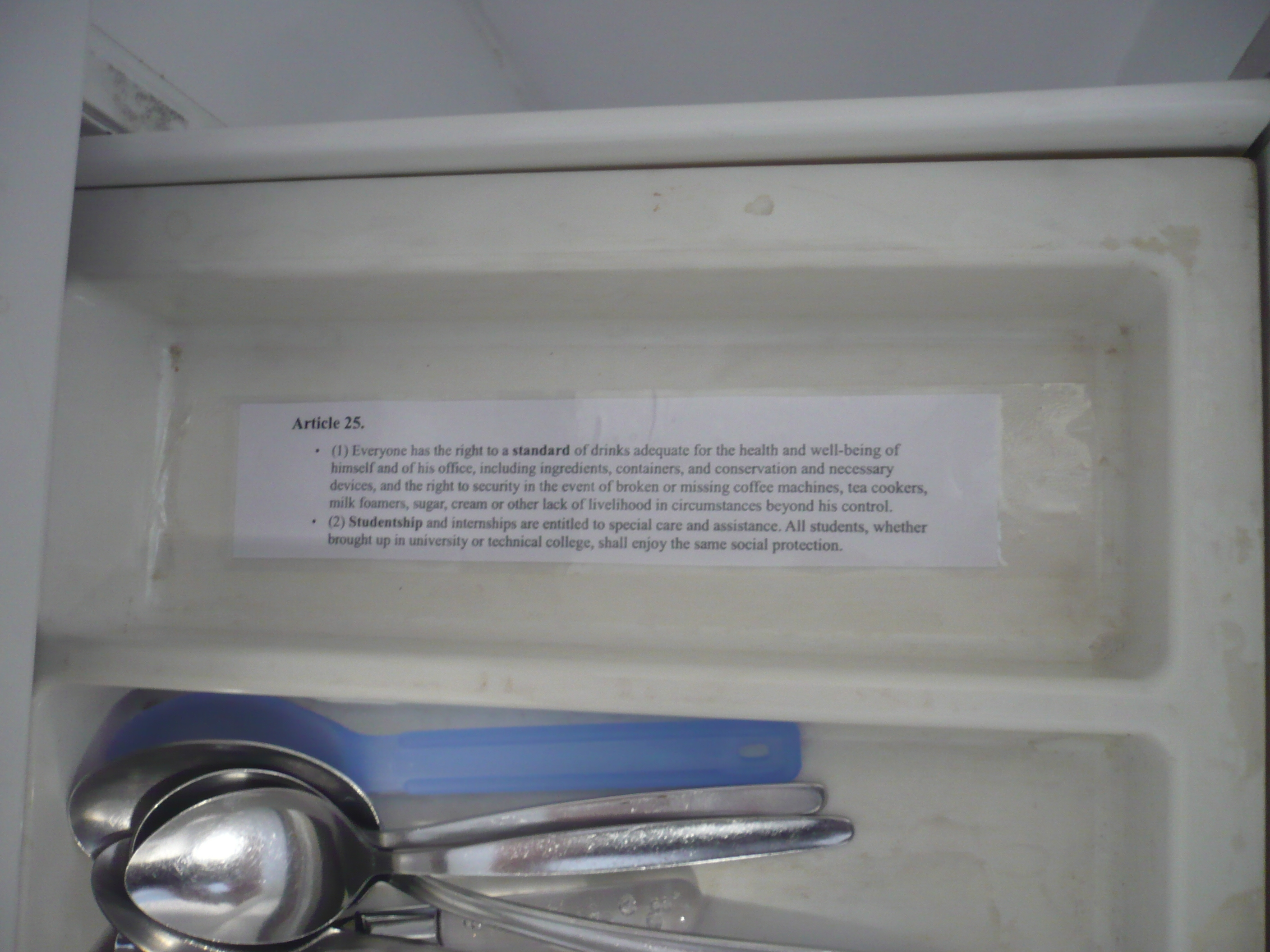 (1) Everyone has the right to a standard of drinks adequate for the health and well-being of himself and of his office, including ingredients, containers, and conservation and necessary devices, and the right to security in the event of broken or missing coffee machines, tea cookers, milk foamers, sugar, cream or other lack of livelihood in circumstances beyond his control. (2) Studentship and internships are entitled to special care and assistance. All students, whether brought up in university or technical college, shall enjoy the same social protection. [in the cutlery drawer]