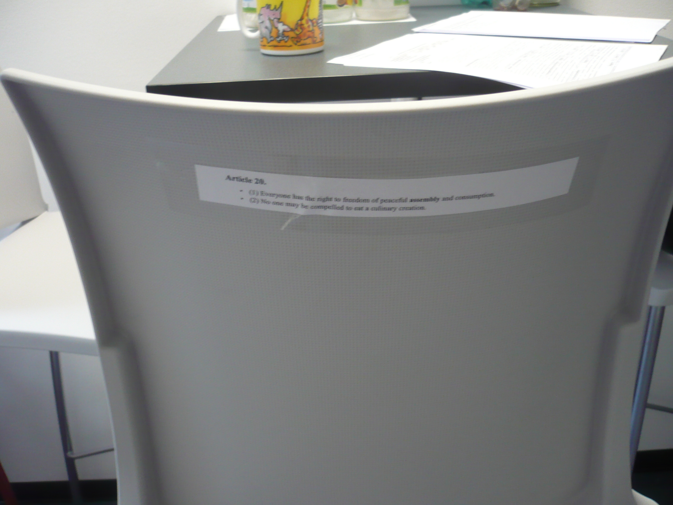 (1) Everyone has the right to freedom of peaceful assembly and consumption. (2) No one may be compelled to eat a culinary creation. [on a chair]