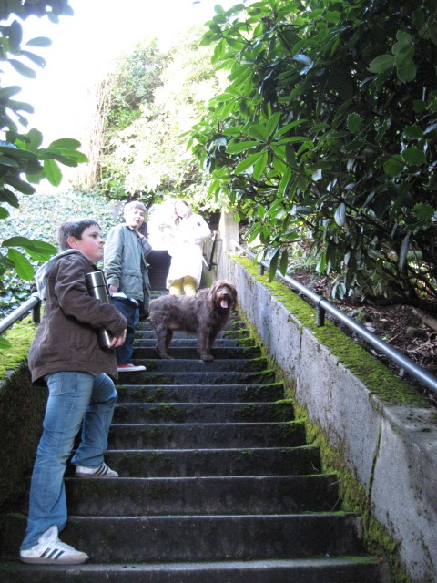 The other issue with the "Secret" Stairs is that... well... there's a lot of them. On our trip, there was more than 284 stairs in our journey alone. Not counting the way down. But anyway, it's better than going all the way around on the streets. So we made 8 cups of hot chocolate and put it in a thermos, packed a picnic basket full of sandwiches, and we set off up the hill with Stanley the Labradoodle.