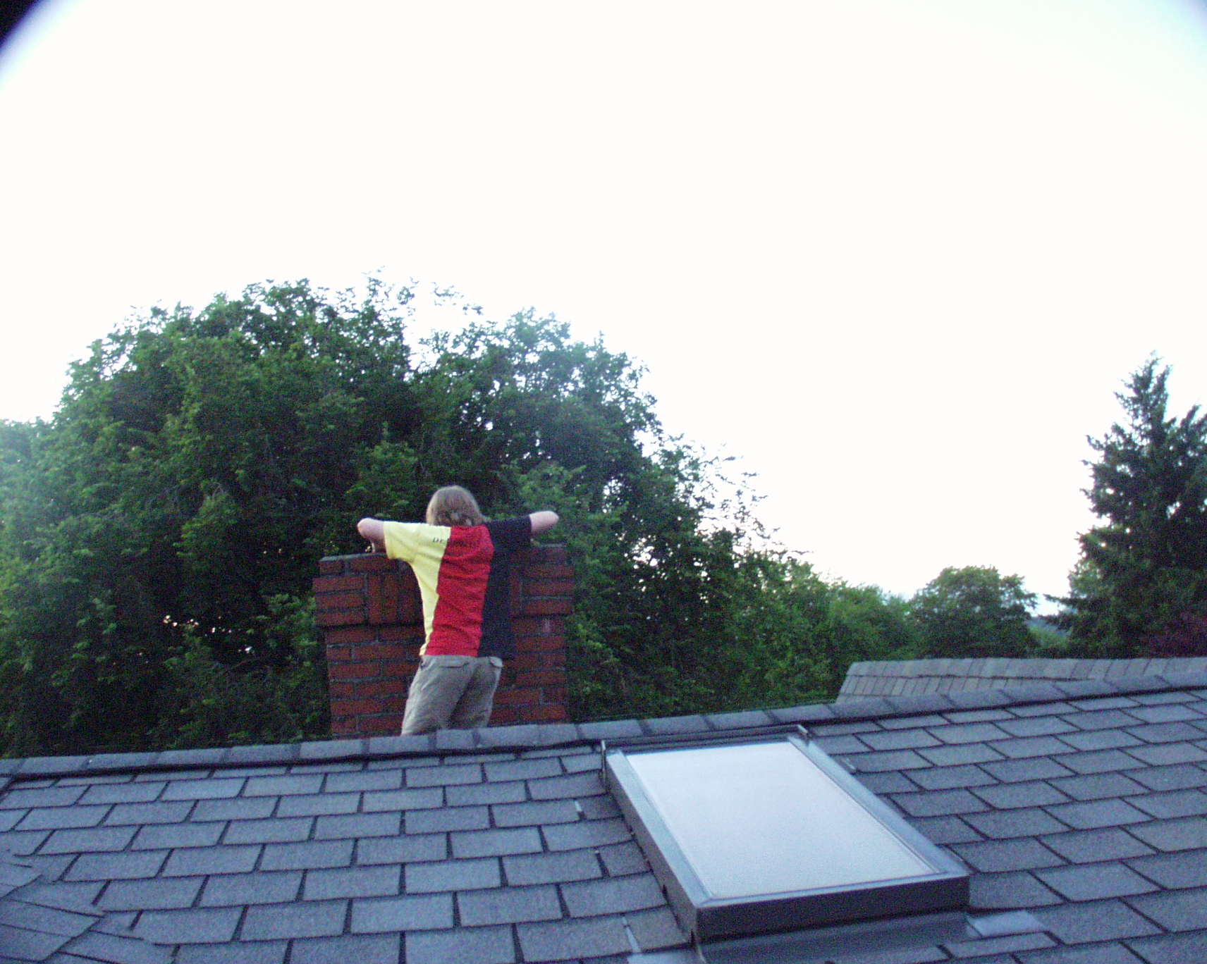Well, first I was going to climb a tree that's about 150 or so feet high, but then I thought, how original. Also, I messed up so many times I decided to quit. I then decided to climb up a tree up to my roof. The highest point is the chimney, and my brother, Dillon, volunteered to take the photos. It was an intense climb on the tree... couldn't even get a picture whilst climbing.