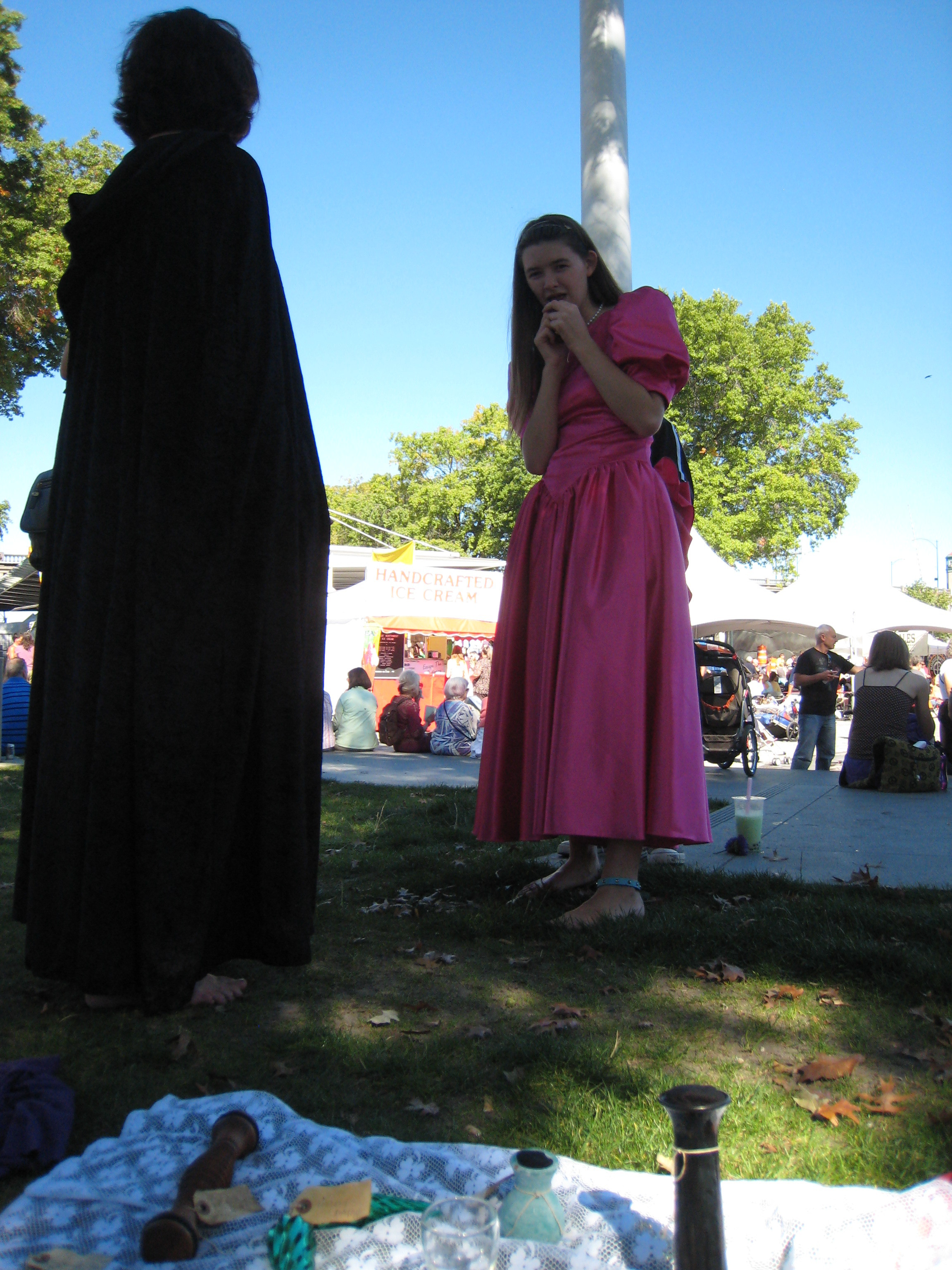 Death: I really enjoyed doing this. I got to see some friends, meet AP R and sell stuff in a British accent. Not to mention drink poison. I sold Insanity (a shirt that said insanity in cursive and had zig-zag line going down the side), and troll-proof-ness.... (a ritual I preformed with a sparkly ribbon.)