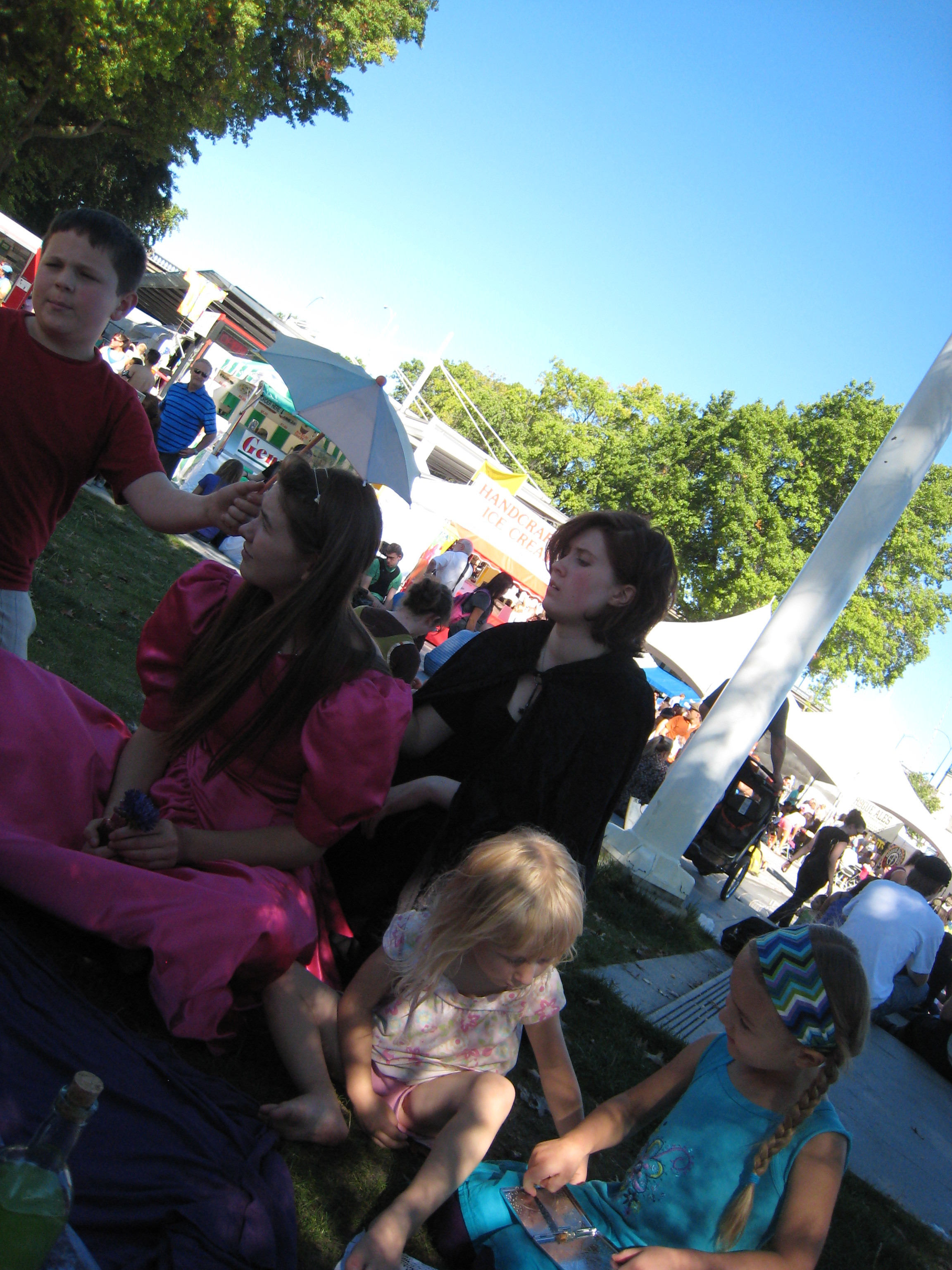 My favorite part of this location was working on my patter. I've very shy, but getting into character, and having such awesome stuff to sell brought out the inner barker in me. I worked up an awesome patter ("DREAM seeds, shiny rocks, wishing feathers regular feathers JAR of sunshine get your fortune told!") which was very satisfying. We mostly sold a bunch of dabs of love on the wrists, and gave away fortunes. I did trade a jar of sunshine to a girl for a memory of a summer's day