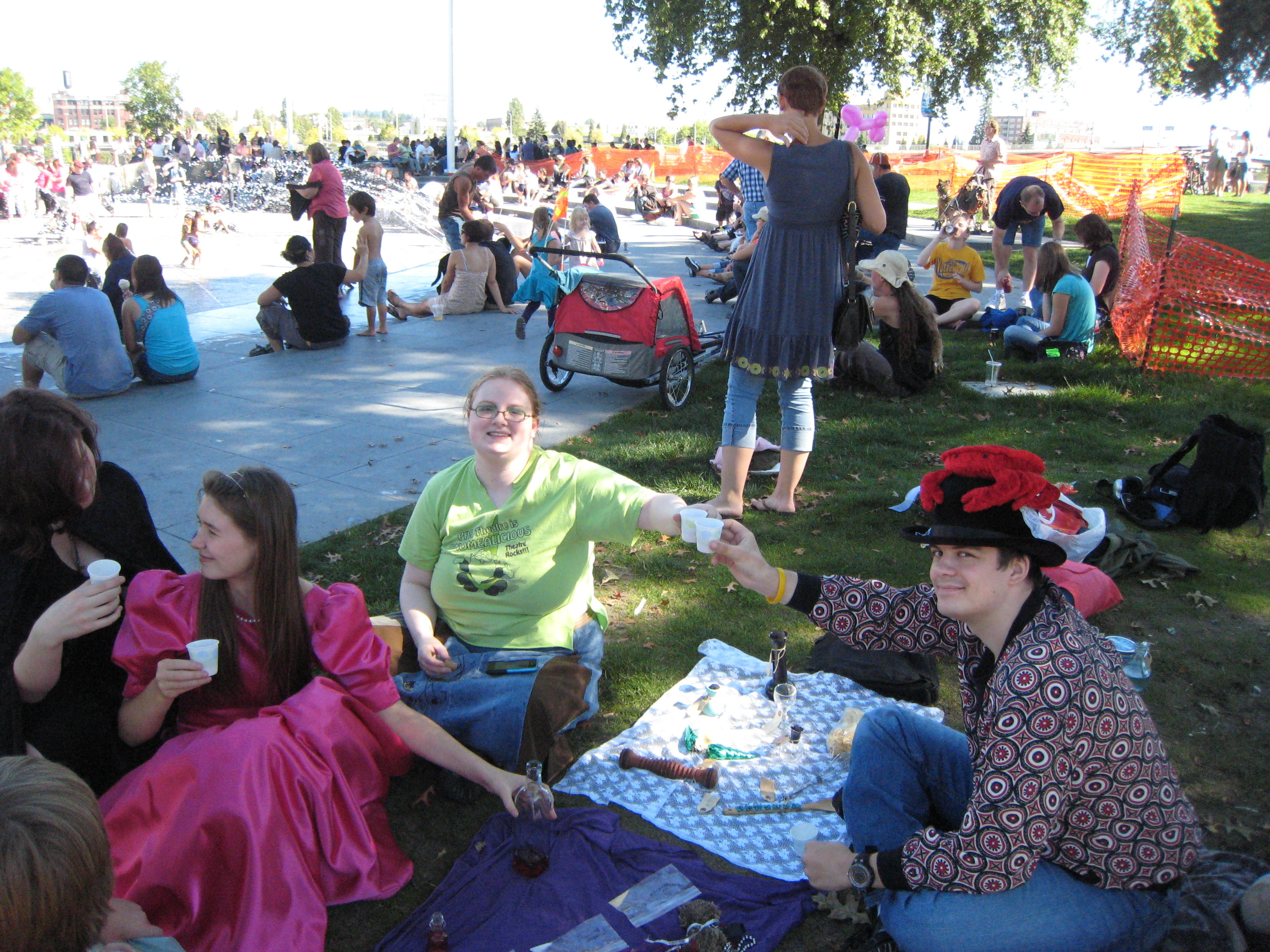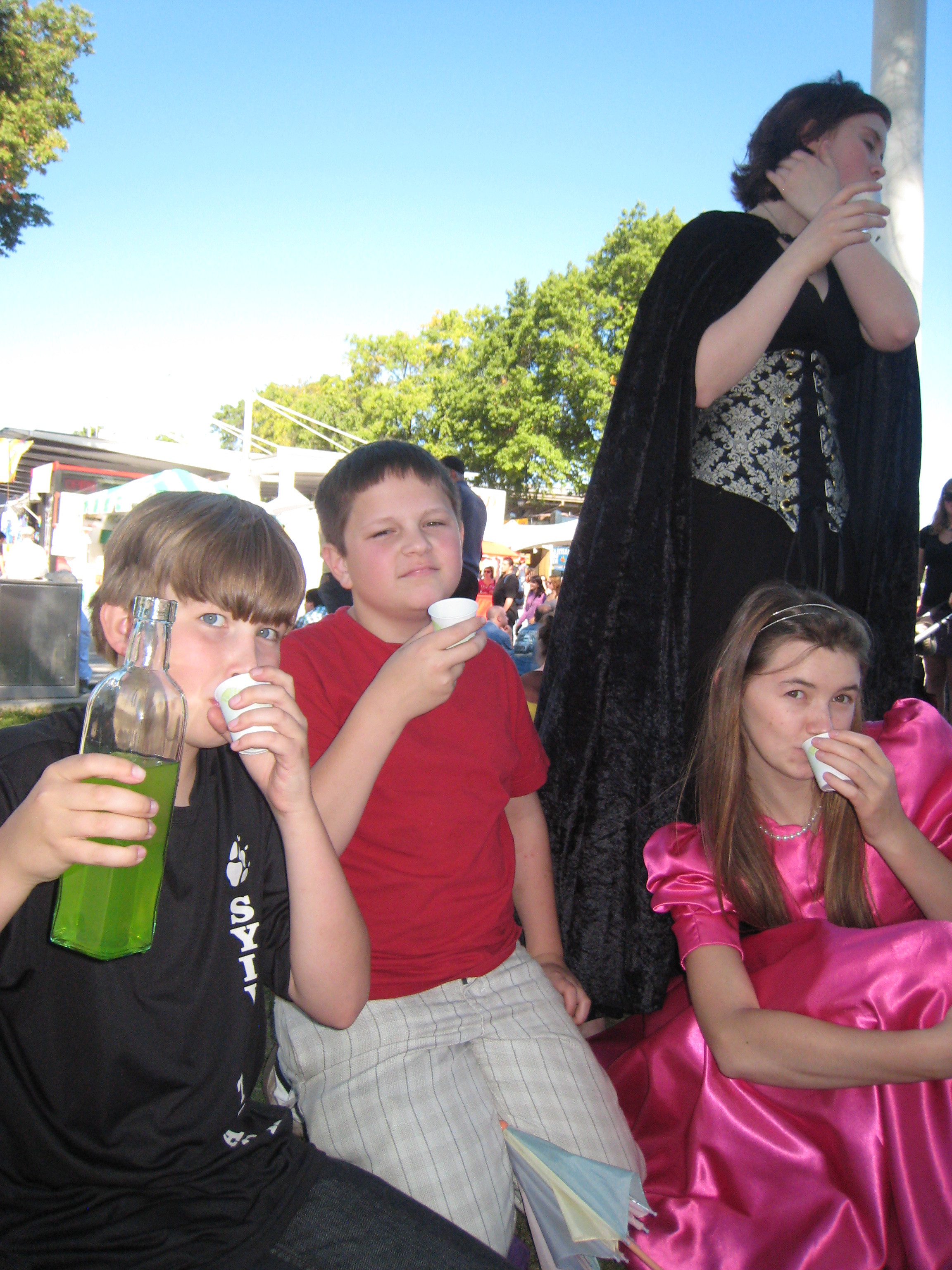 APR: I was a late joiner to this task, and only came up with what to create to sell at the last minute. I stopped off at a couple stores, picked stuff up, and assembled it the day before the tasking. When the day arrived, I headed down early, so that I could see what the Saturday Market in Portland was like, since I hadn't been before. After a while of wandering through the market, I found the rest of the intrepid taskers, and went about setting up my bounty of Manticore Poison (causes pain against your greatest foe, costs the name of your greatest foe), Vampires Blood (exacts revenge against an adversary, costs the name of the adversary), Phoenix Ashes (one reincarnation, costs the heat of your breath), Golem Dandruff (enhanced perseverance, costs some of your own dandruff), Minotaur Horn (great strength, costs a tale of being lost or confused), and Centaur Hoof (great speed, costs a tale of humiliation). Unfortunately I wasn't much of a salesman, and thus was unable to actually barter any of my goods. I portrayed an exotic animal hunter while trying to sell my goods.